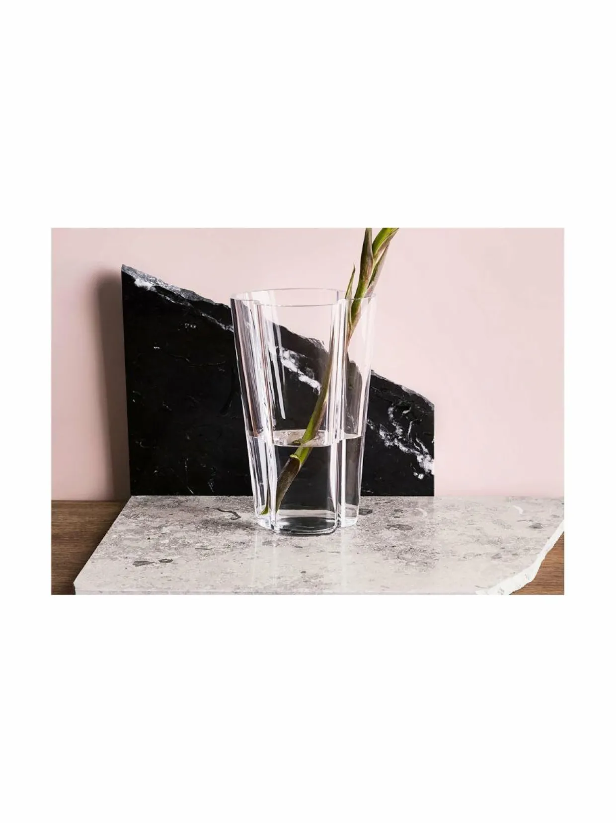 Alvar Aalto -kokoelman Aalto-maljakko on korkeudeltaan 220 mm. Suomalaisen muotoilun klassikko on materiaaliltaan käsinpestävää lasia.