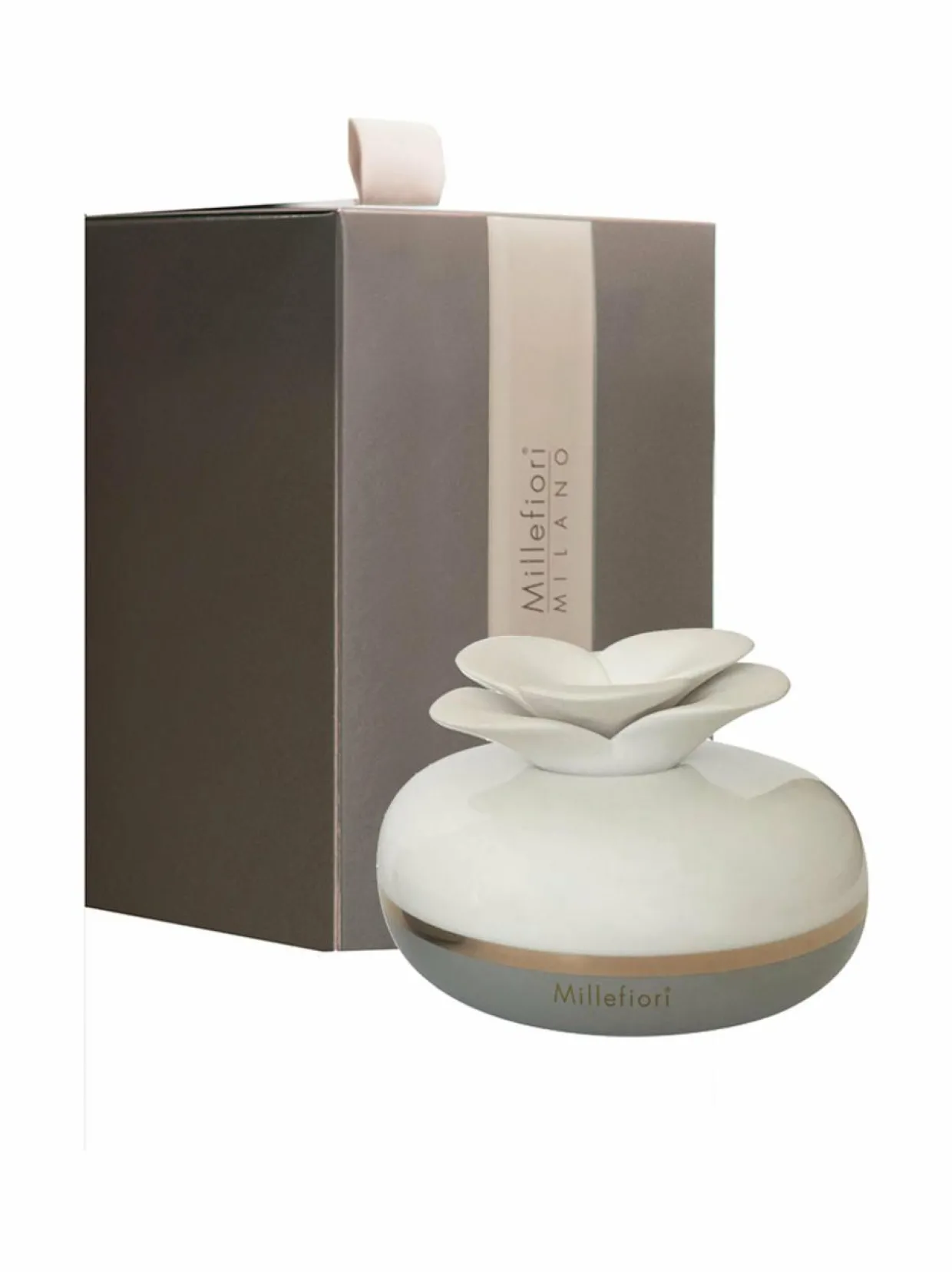 Kaunis, kukan mallinen keraaminen Air Design -diffuuseri on tarkoitettu käytettäväksi yhdessä Millefiori-tuoksunesteen kanssa. Lisää vain maljaan valitsemasi tuoksuneste ja nauti miellyttävästä tuoksusta.