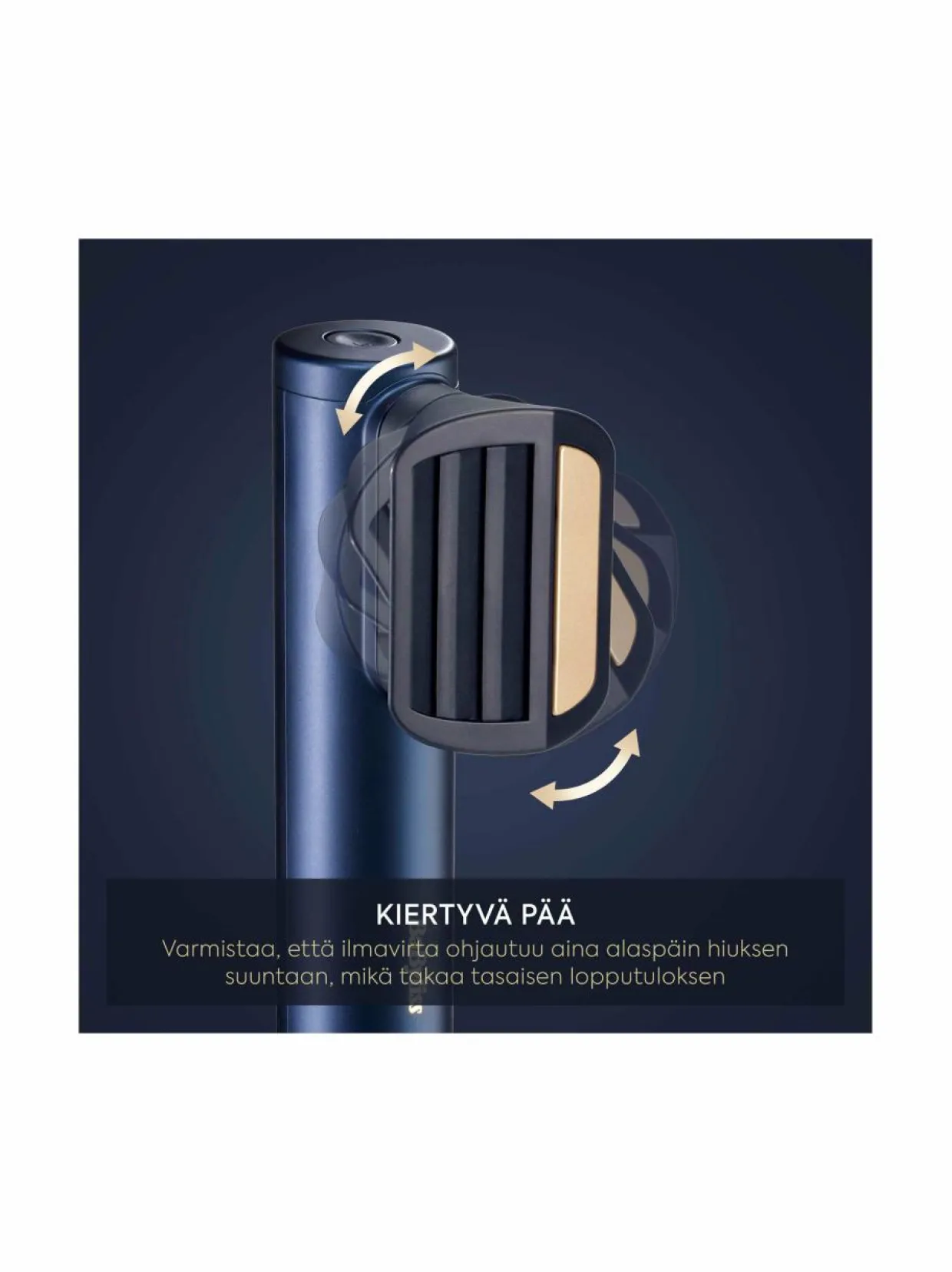 Lisävaruste pyörii sen varmistamiseksi, että ilma suunnataan aina hiusosiota pitkin alaspäin hiusten helppoa silottamista varten.