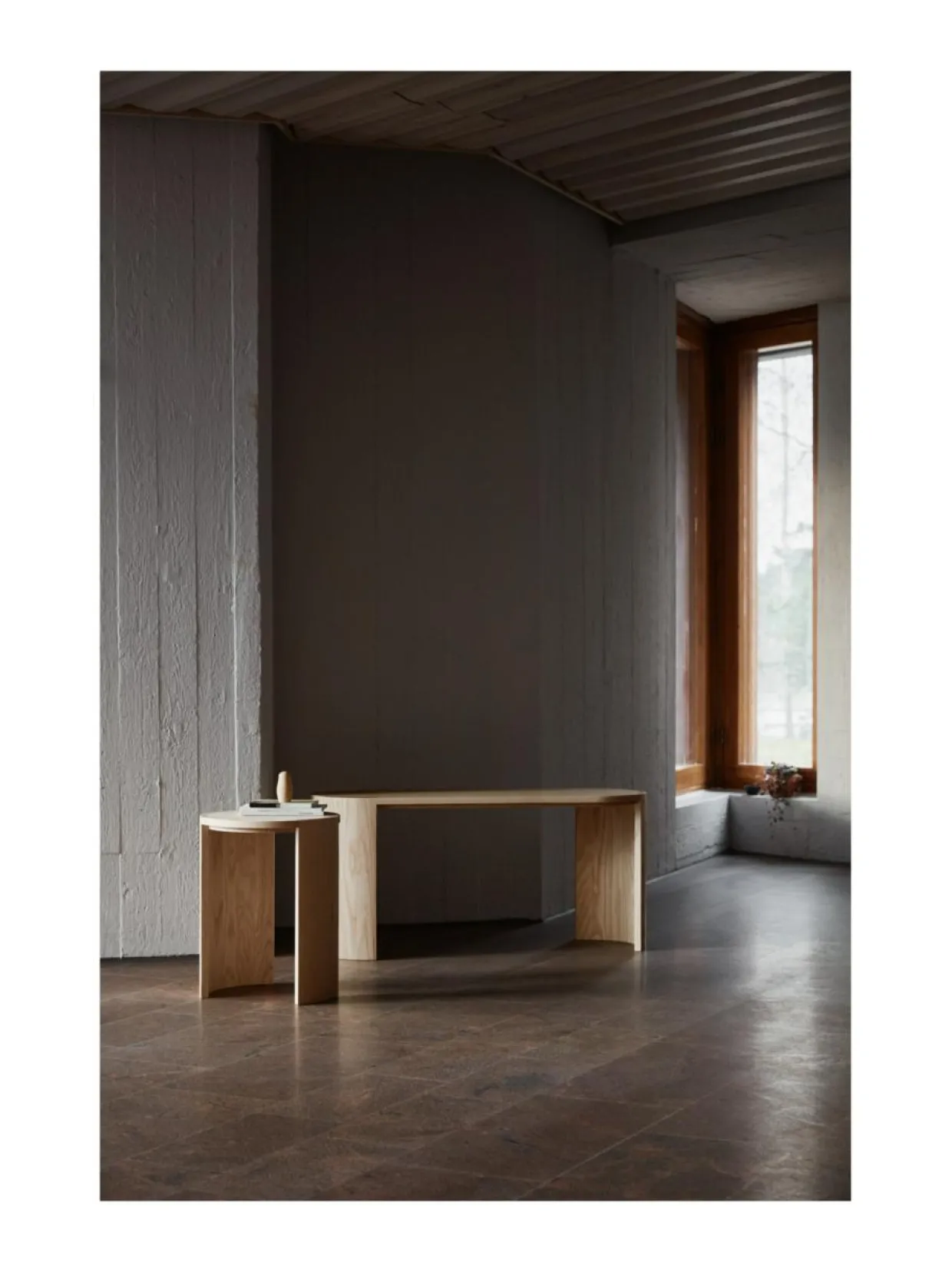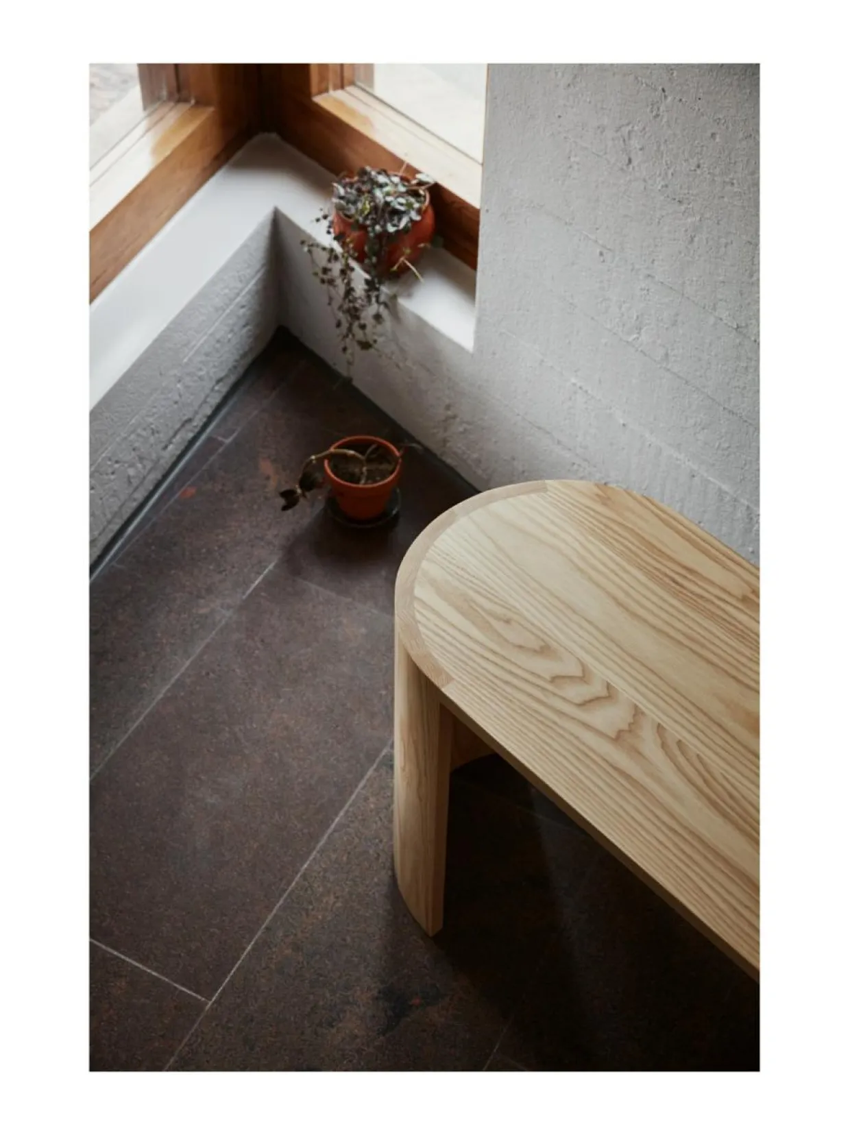 Joanna Laajisto suunnitteli tämän viehättävän massiivisaarnisen kalusteen alunperin osaksi Turun saaristossa sijaitsevan Villa Airisto -majatalon sisustusta. Saaristolaisuus näkyykin harkitussa muotokielessä, joka korostaa kauniisti jakkaran jalkarakenteen epäsymmetristä muotoa ja antaa tilaa puun luontaiselle ilmeelle.