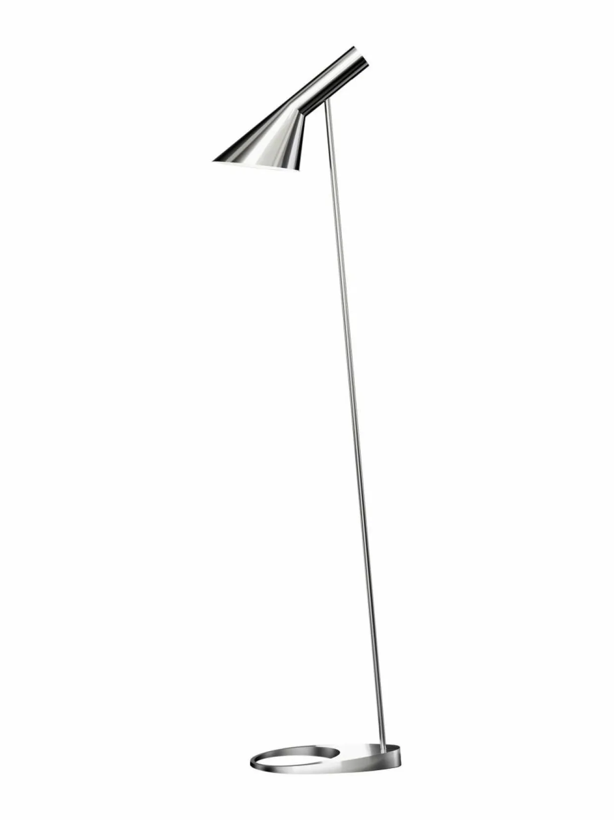 Arne Jacobsen suunnitteli yksinkertaisen tyylikkään AJ-valaisimen vuonna 1960 Kööpenhaminan Radisson SAS Royal -hotelliin. Ajattoman muotokielensä ansiosta valaisin sopii hyvin monenlaiseen ympäristöön. Kallistuva varjostin voidaan säätää haluttuun asentoon ja kohdistaa valo juuri sinne, missä sitä tarvitaan. Valaisimen korkeus on 130 cm, varjostimen pituus 32,5 cm ja jalustan halkaisija 27,5 cm. Sähköjohdon väri on musta.