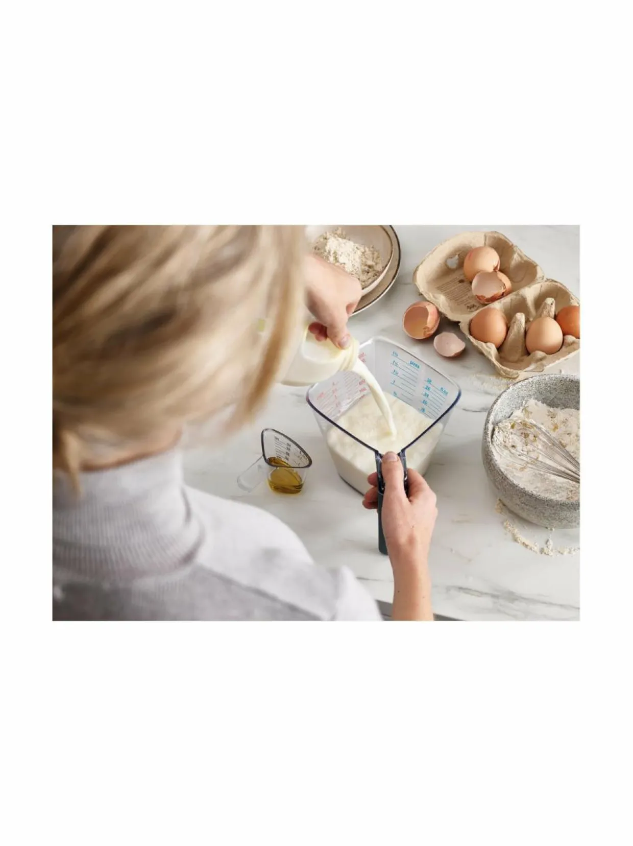Mittakannu mahdollistaa mittojen lukemisen ylhäältä kaataessasi kulhosta nestettä tai muita aineksia. Sen mukana tulee minikannu, jolla voit tarkasti mitata pienempiä määriä, ja se voidaan kiinnittää isomman kannun kädensijaan. Sopii enintään 70C lämpöisille ainesosille. Ison kannun tilavuus on max 1 litra, pienen kannun max 50 ml.