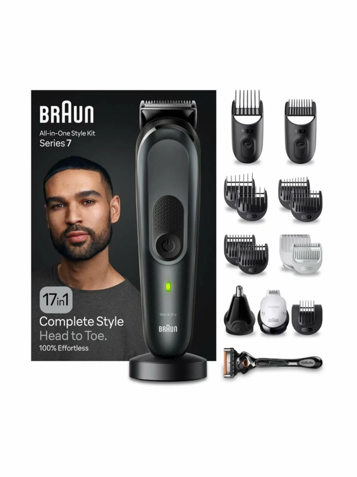 Huolittele vartalo päästä varpaisiin Braun All-in-One Series 7 -muotoilusetillä. Muotoilusetti parralle, hiuksille, viimeistelyyn ja vartalon ihokarvojen käsittelyyn. Braunin terävin ProBlade, AutoSense-teknologia ja 100 minuutin käyttöaika.