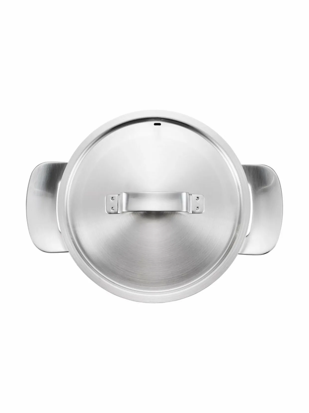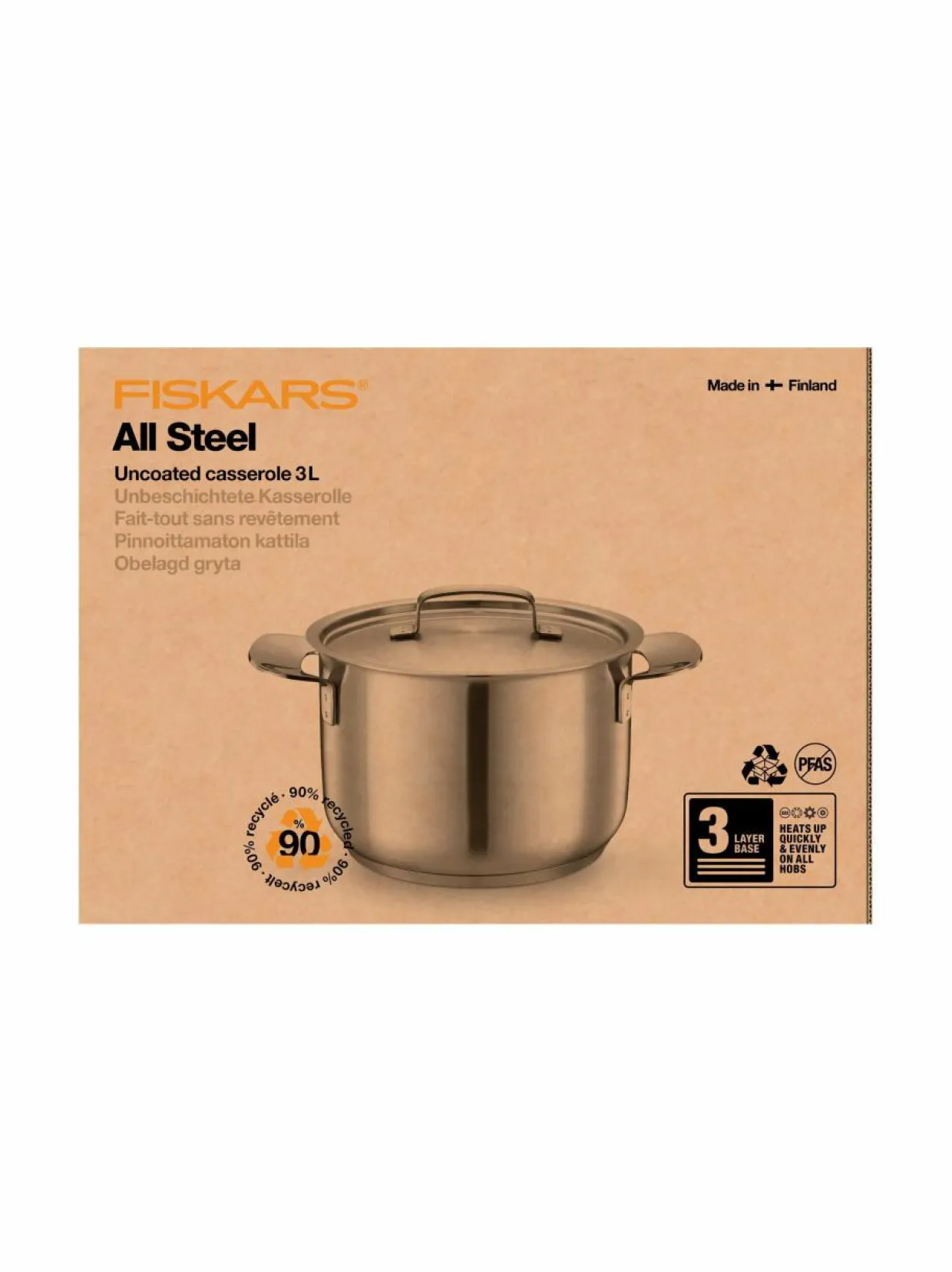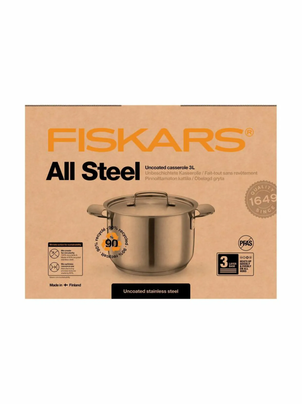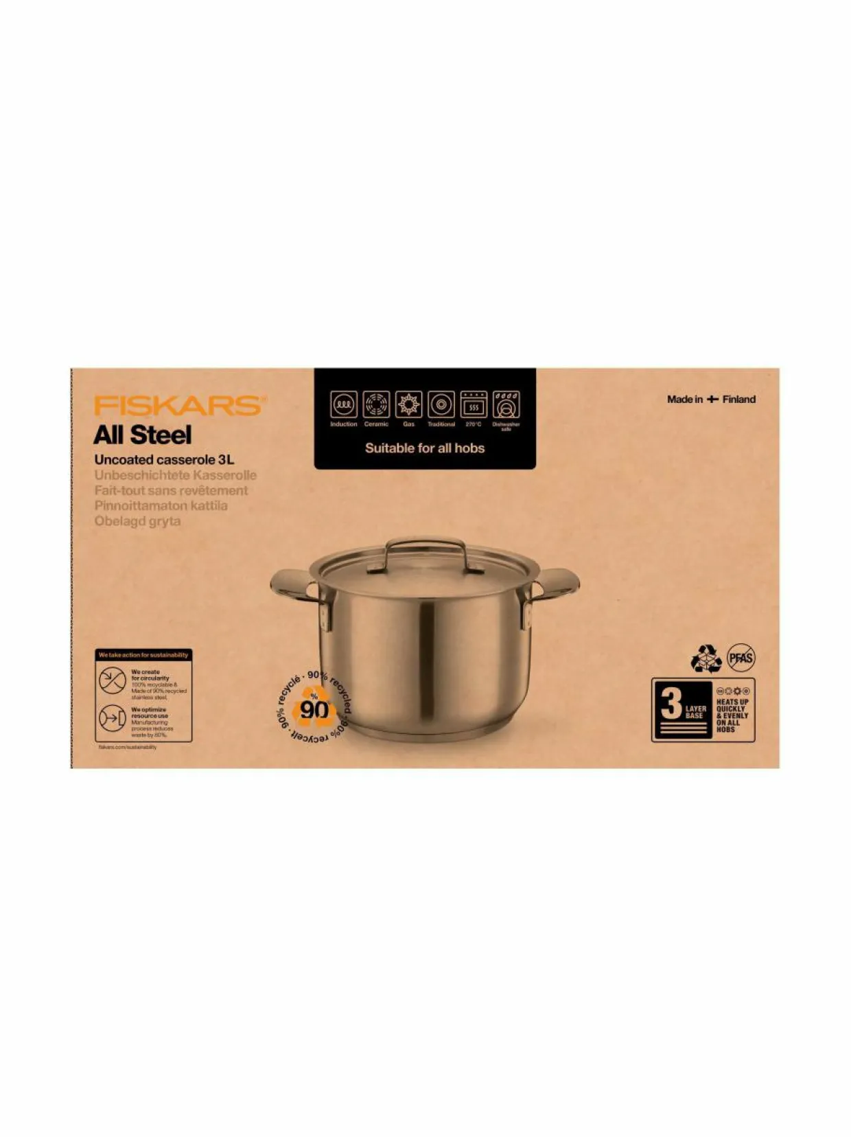 Tämä Fiskarsin All Steel -kattila on kierrätettyä ruostumatonta terästä. Sen paksu, kolmesta kerroksesta koostuva pohja kuumentuu tasaisesti kaikentyyppisillä liesillä. Sopii vaativammallekin kokille. Konepesun kestävä. Uuninkestävä 270 °C asti.
