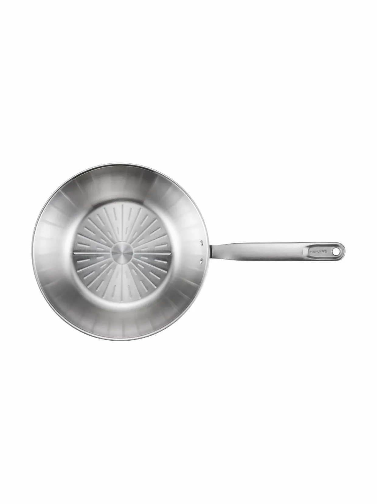 Fiskars All Steel Pure -wokkipannussa on kolmikerroksinen pohja, joka lämpenee tehokkaasti ja tasaisesti. Pinnoittamattomat Fiskars All Steel pure -pannut kestävät korkeitakin lämpötiloja, ja ne voi laittaa uuniin. Pannua voi käyttää kaikenlaisilla liesillä.