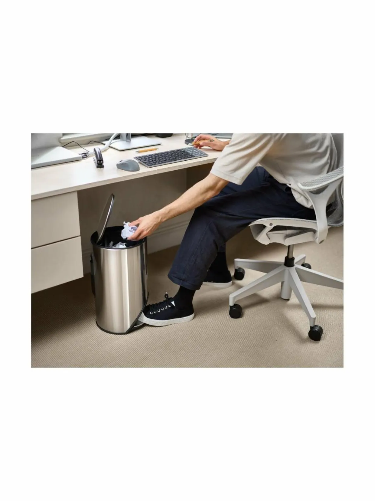 Arc-roskakori on ihanteellinen kapeisiin tiloihin ja pienempiin huoneisiin, kuten kylpyhuoneisiin, kodinhoitohuoneisiin tai toimistotiloihin. Poljintoiminto mahdollistaa kannen avaamisen helposti ja hygieenisesti ilman käsillä koskettamista.Tuotenumero170120089 MateriaaliTeräs Hoito-ohjeetPyyhi ulkopinnat kostealla liinalla ja kuivaa pehmeällä, kuivalla liinalla – vältä hankaavia liinoja tai vahvoja kemiallisia puhdistusaineita, jotta teräspinta säilyttää kauniin viimeistelynsä. ValmistusmaaKiina VäriSTAINLESS STEEL Koko26 x 26 x 45 cm AvainsanatJoseph Joseph, roskakori, poljinroskakori