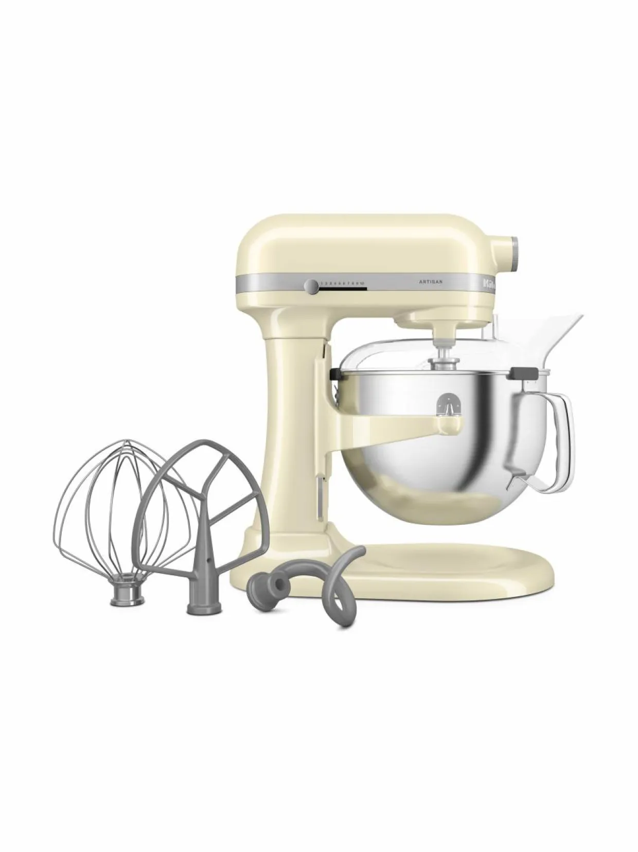 KitchenAid Artisan -seisontasekoitin on vankka ja kestävä, ja siinä on täysmetallinen rakenne, mukaan lukien painevaletut metalliset säätönupit. Koneessa on 11 nopeutta, korkeasta matalaan ja kaikkea siltä väliltä. Sen moottori on sekoittimen päässä, joten moottorin ja lisävarusteiden välillä ei ole tehohäviöitä. Käsittele jopa 11 tusinaa keksejä, tee jopa 11 pizzaa, vatkaa 8 munanvalkuaista ja silppua 1 kg kanaa. Sekoita, taittele, vatkaa, vaivaa taikinaa ja silppua jopa kypsennettyä lihaa mukana toimitetuilla hopeapäällysteisillä sekoittajan lisävarusteilla.