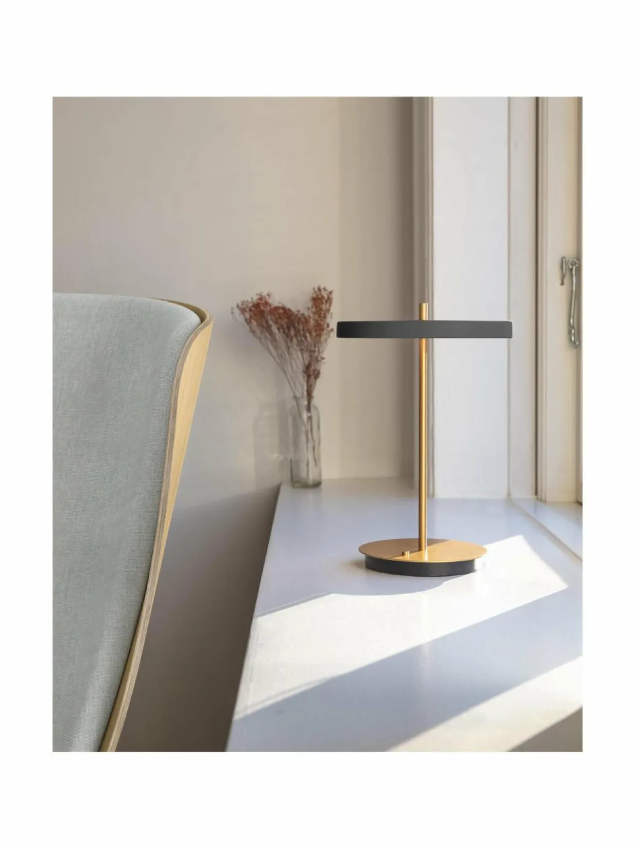 UMAGE Asteria Move -pöytävalaisimen skandinaavisen minimalistinen muoto on saanut innoituksensa tähdenlennosta. Kiinteän LED-lampun valo siivilöityy tasaisesti pehmeän valkoisen diffuusorin lävitse