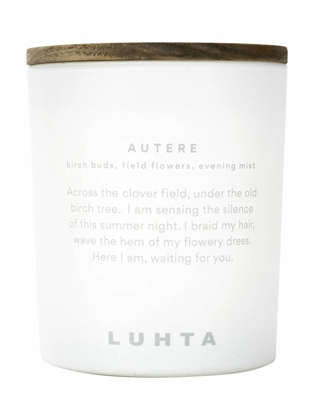 Pohjoismaiseen tyyliin suunniteltu Autere-tuoksukynttilä tuo kotiimme muiston niittykukan tuoksuisesta kesäillasta. Sisustuksellinen tuoksukynttilä on pakattu ajattomaan valkoiseen mattapintaiseen lasiin, jossa on puinen kansi. Paloaika n. 30 h. Kynttilä on mitä mainion lahjaidea.