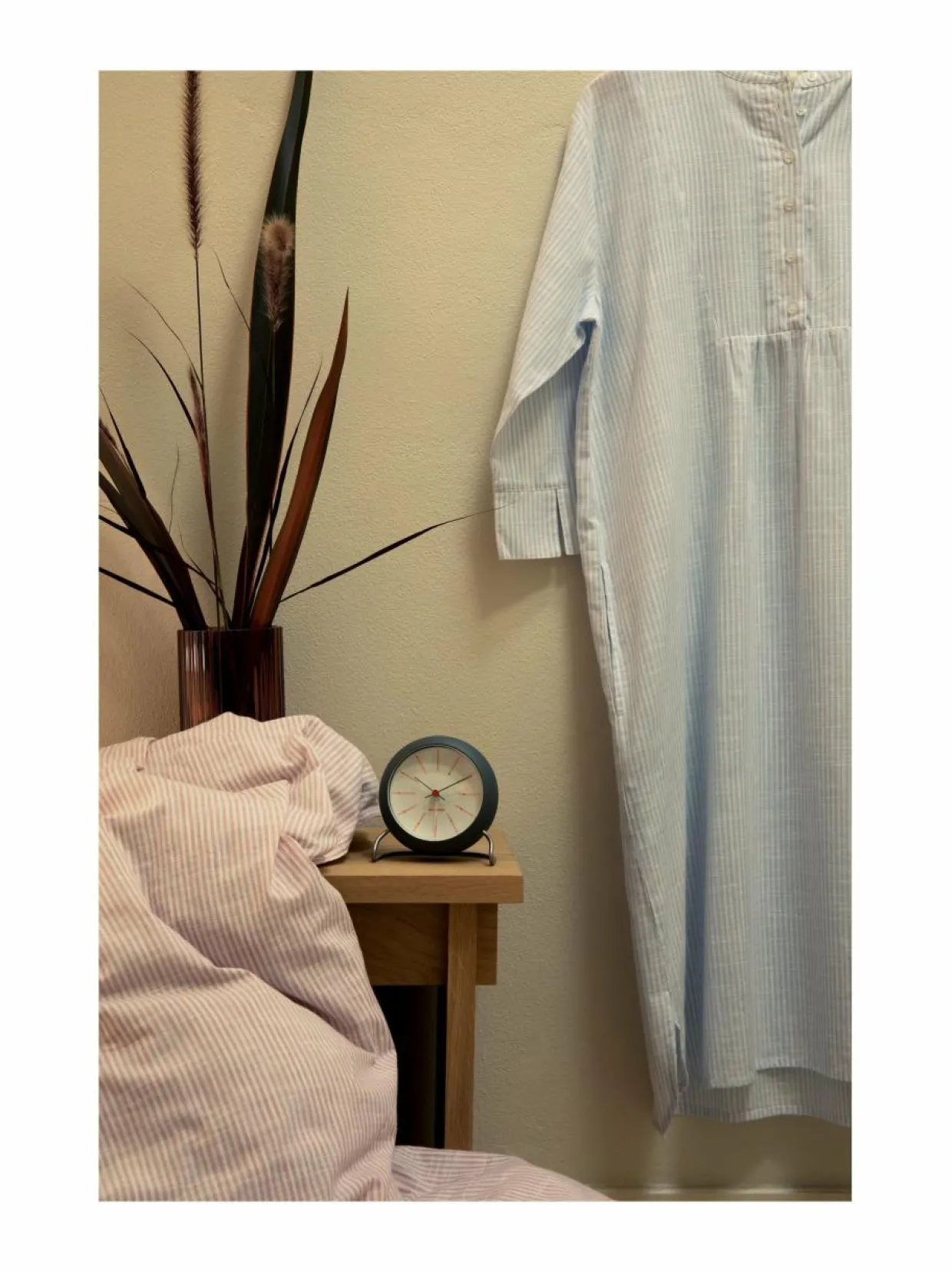 Arne Jacobsenin AJ Bankers -pöytäkello herätystoiminnolla on valmistettu karkaistusta iskunkestävästä lasista, jossa on vankka jalusta ruostumatonta terästä. Tämä malli on päivitetty versio elegantista pöytäkellosta, jonka tanskalaisarkkitehti piirsi vuonna 1939. Linjakkaat metallijalat viittaavat Jacobsenin ikonisiin tuolimalleihin, ja graafinen kellotaulu on lainattu kellomallista, jonka hän suunnitteli osaksi Tanskan kansallispankin sisustusta vuonna 1971. Uutta ovat torkkutoiminto ja valosensori. AJ Bankers -pöytäkello on koristeellinen ja minimalistinen elementti sisustuksessasi. Paristo 2 kpl AA – ei sisälly.