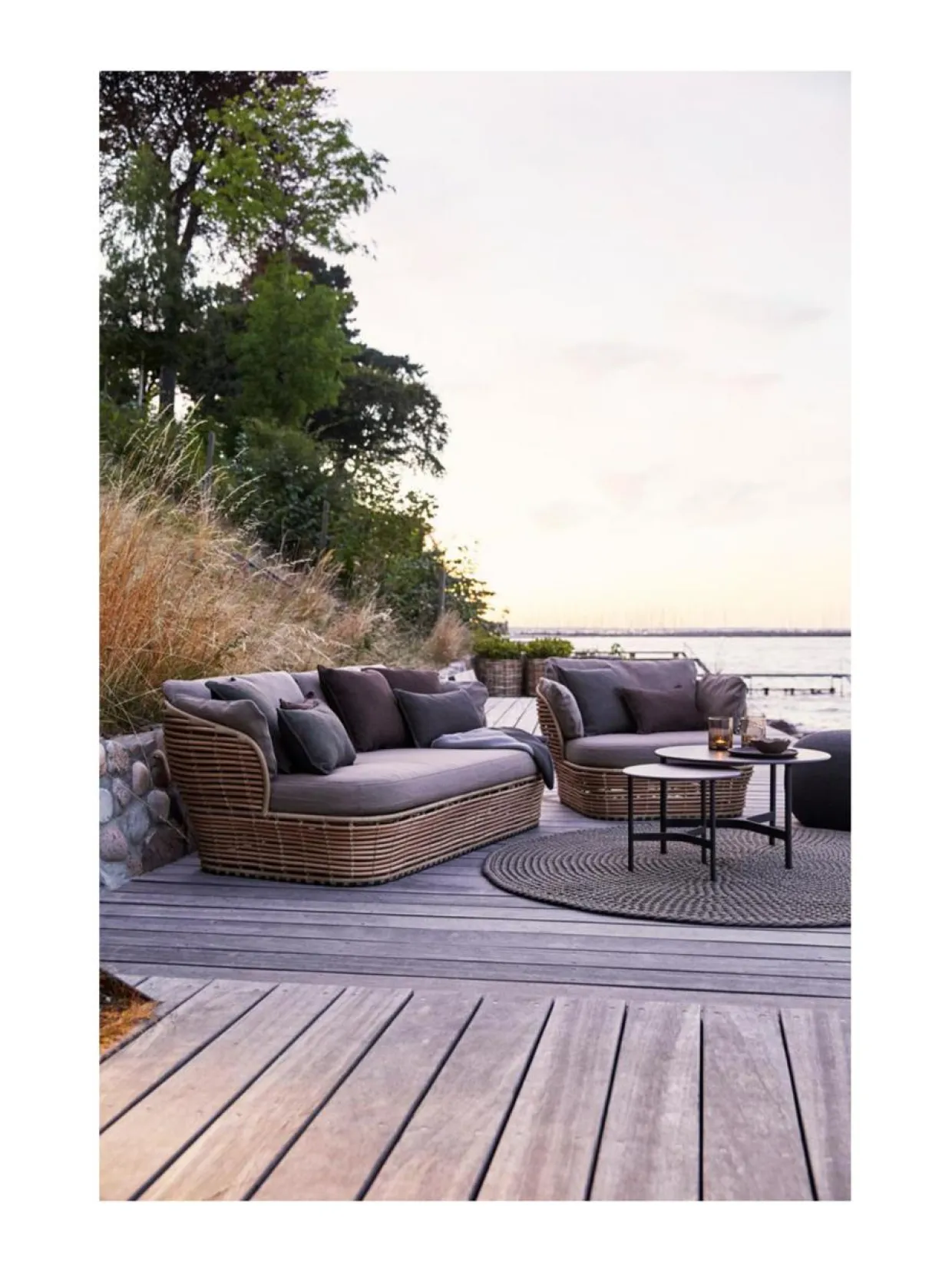 Basket-nojatuoli ulkokäyttöön. 110 cm lev, 100 syv, 70 kork, 40 istuinkork. Muhkea ja mukava Cane-Line Air Touch taupe tyynysetti sisältyy hintaan. Luonnonvärinen Cane-line Weave® -punosmateriaali, pulverimaalattu teräsrunko.