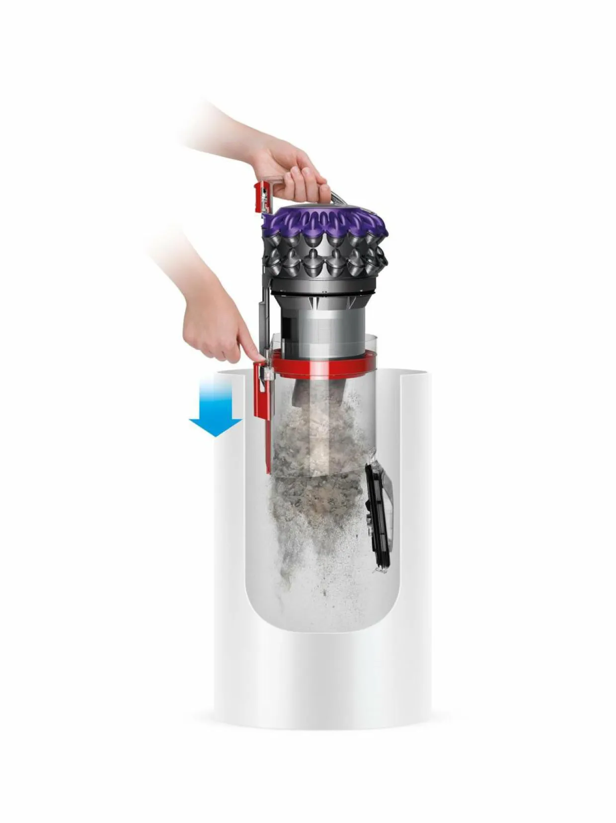 Pölypussittoman imurin läpinäkyvä pölysäiliö on helppo ja hygieeninen tyhjentää, ja uuden tyhjennysmekanismin avulla syklonin väliin ei jää roskia tai pölypalloja. Pölysäiliön tilavuus on 1,8 l.