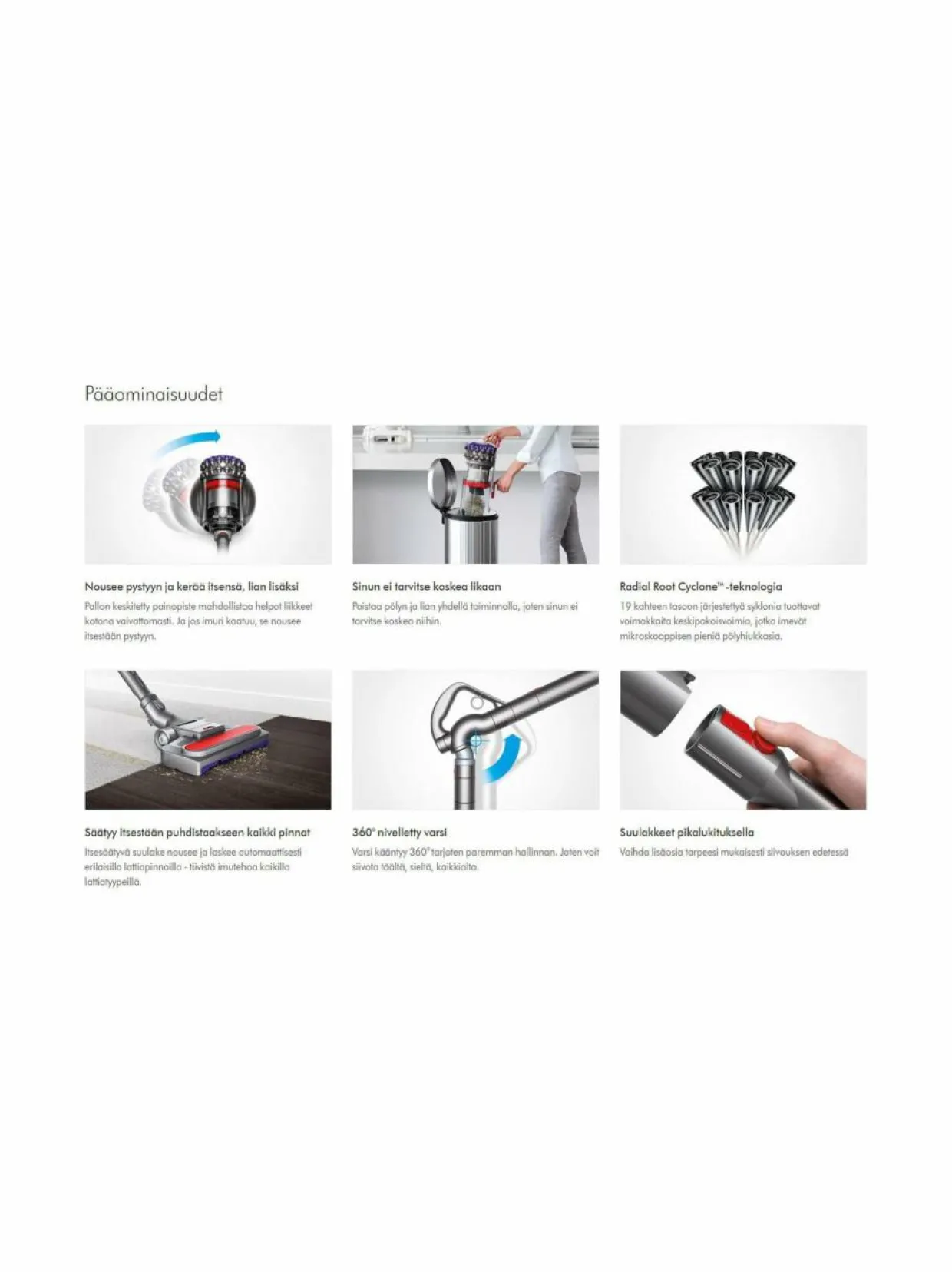Pöly ja lika irrotetaan ilmasta Radial™-sykloniteknologian ja keskipakoisvoiman avulla. 28 kappaletta kahteen kerrokseen aseteltua syklonia tuottavat suuren keskipakoisvoiman, joka vangitsee entistä enemmän hienojakoista pölyä ja allergeeneja läpinäkyvään pölysäiliöön.