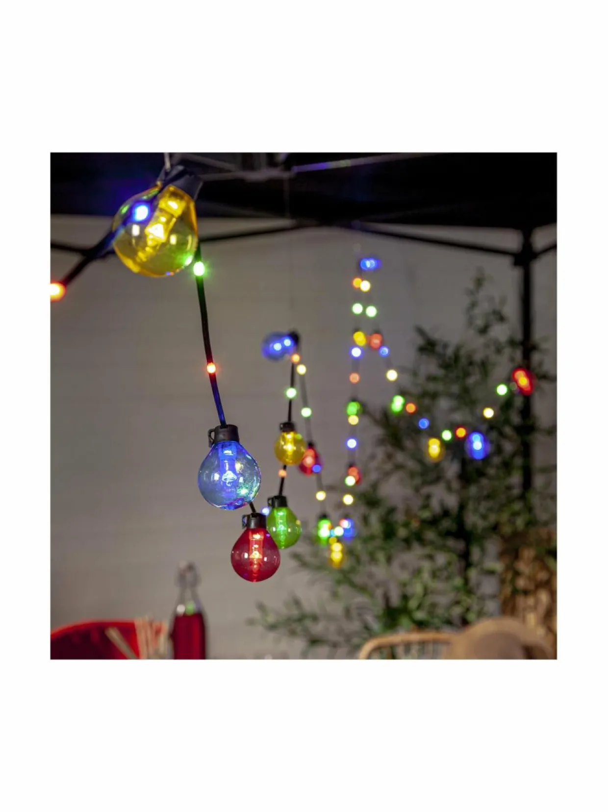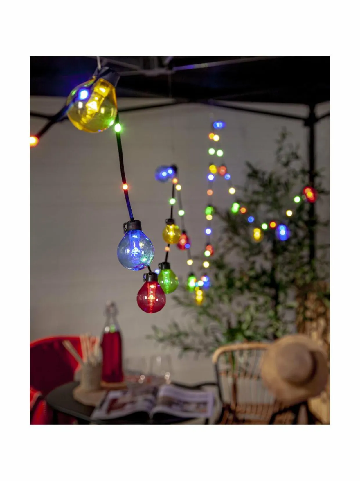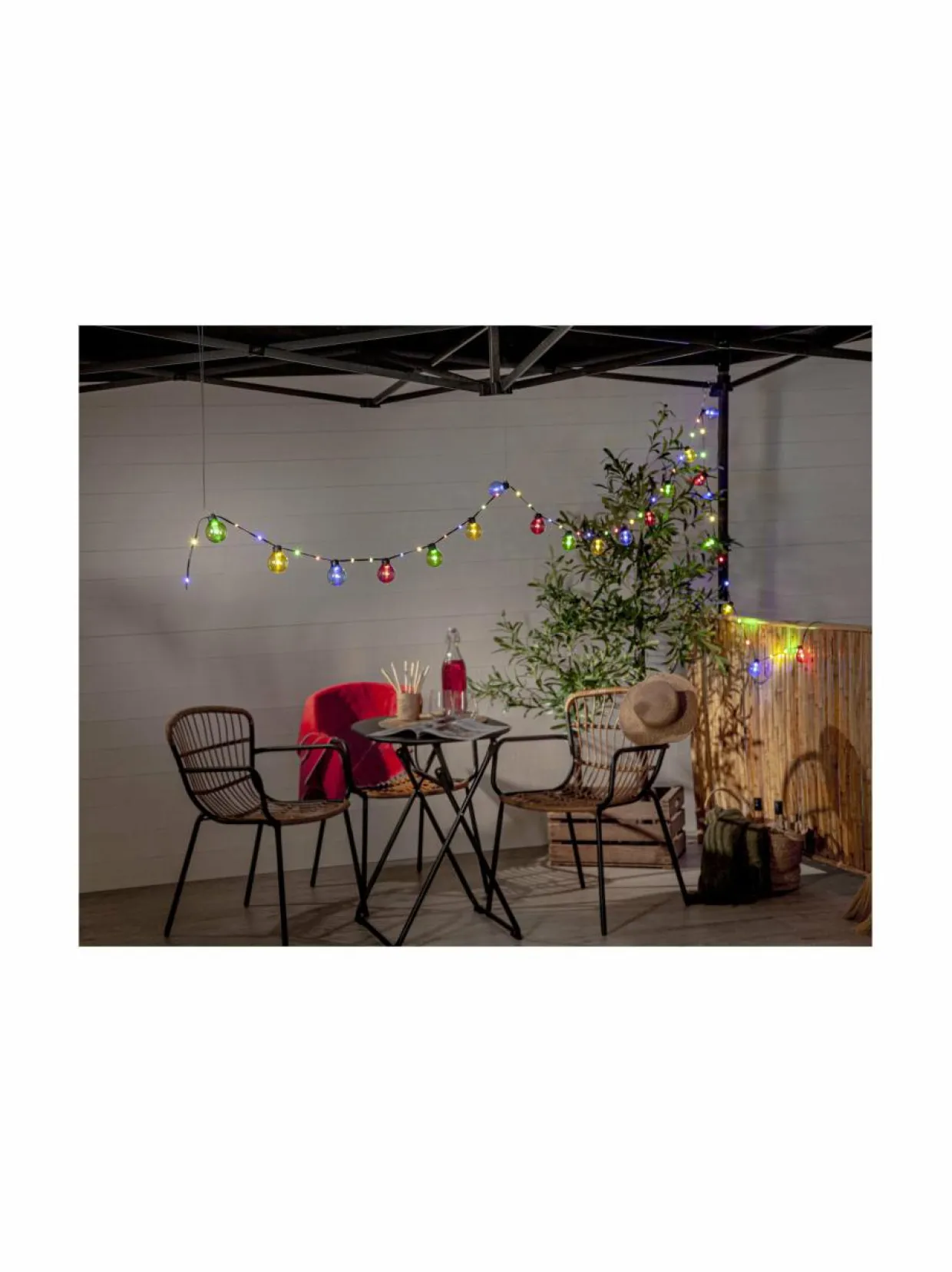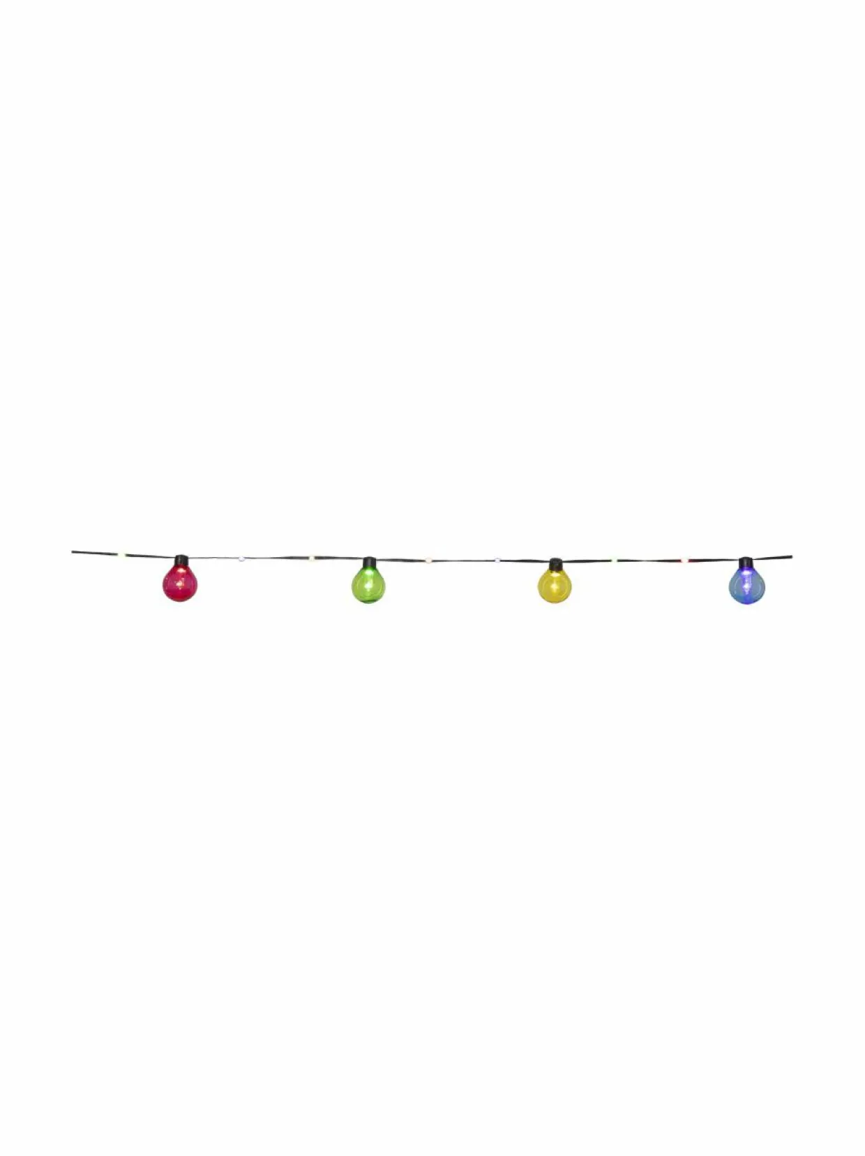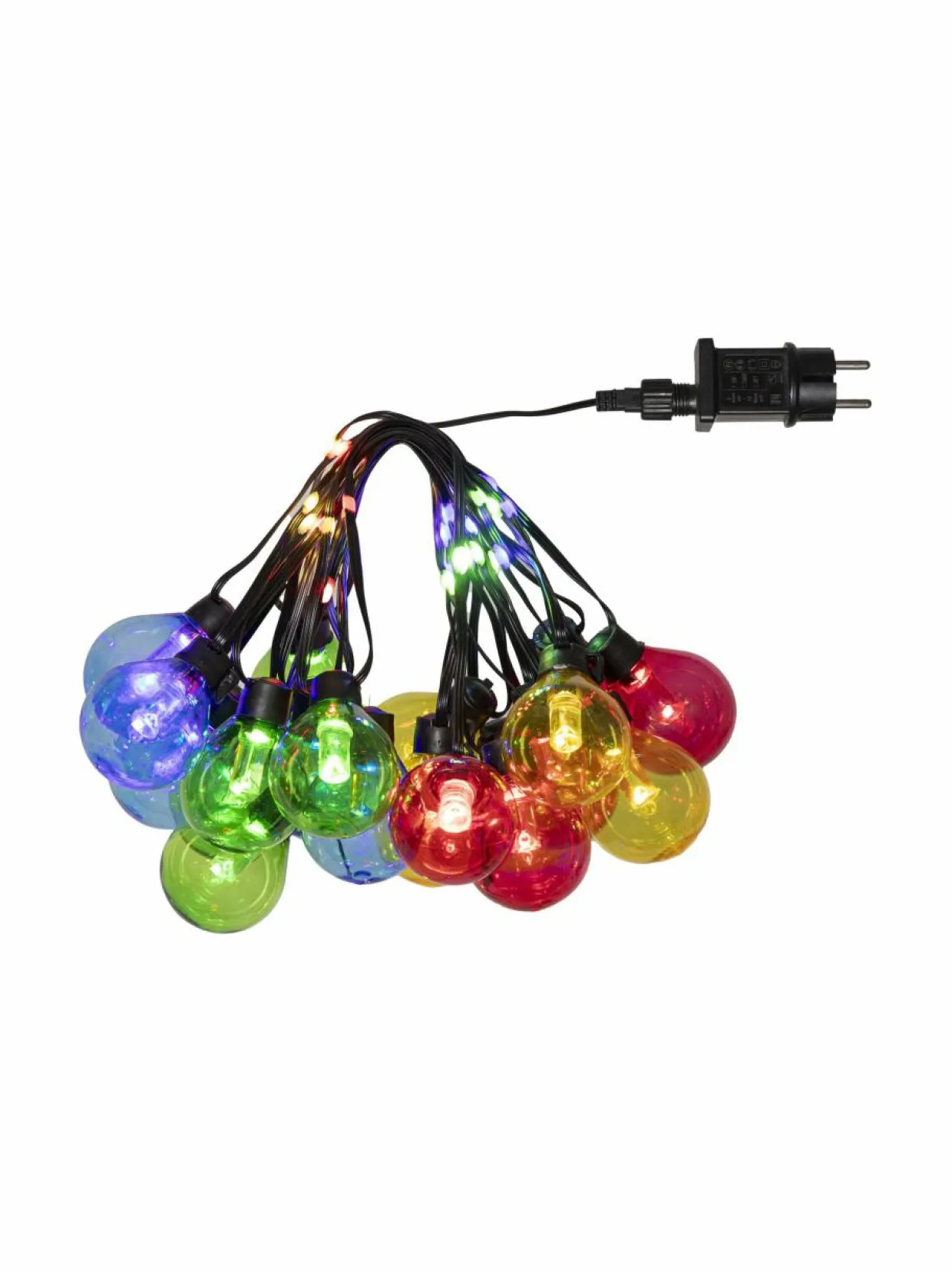 Ulkokäyttöön sopiva Star Trading Bolla 60 LED -valosarja, jossa on 20 halkaisijaltaan 4 cm olevaa moniväristä pyöreää lamppua, lisäksi jokaisessa lamppuvälissä on kaksi moniväristä LED-valoa. Valosarja sopii sekä arkeen että juhlaan. Kaapeli on litteä ja ohut, ja lamppujen väli 10 cm. Valosarjassa on 8 eri vilkkumistoimintoa, joista voit valita mieleisensä painamalla muuntajassa olevaa nappia. Johdon pituus 500 cm. Pituus 530 cm. Leveys 5 cm. Korkeus 6 cm. Kiinteä LED, lamppuja ei voi vaihtaa. IP-luokitus IP44. Lamppu: 60 LEDiä yhteensä 2 W.