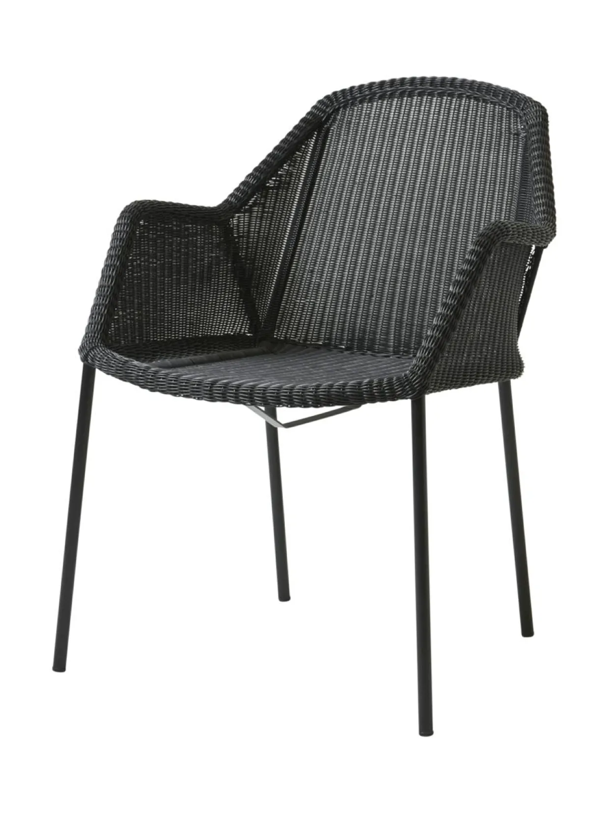 Breeze-tuoli ulkokäyttöön, pinottava. 60 cm lev, 62 syv, 83 kork, 45 istuinkork. Musta Cane-line Weave® -punosmateriaali, alumiinirunko.