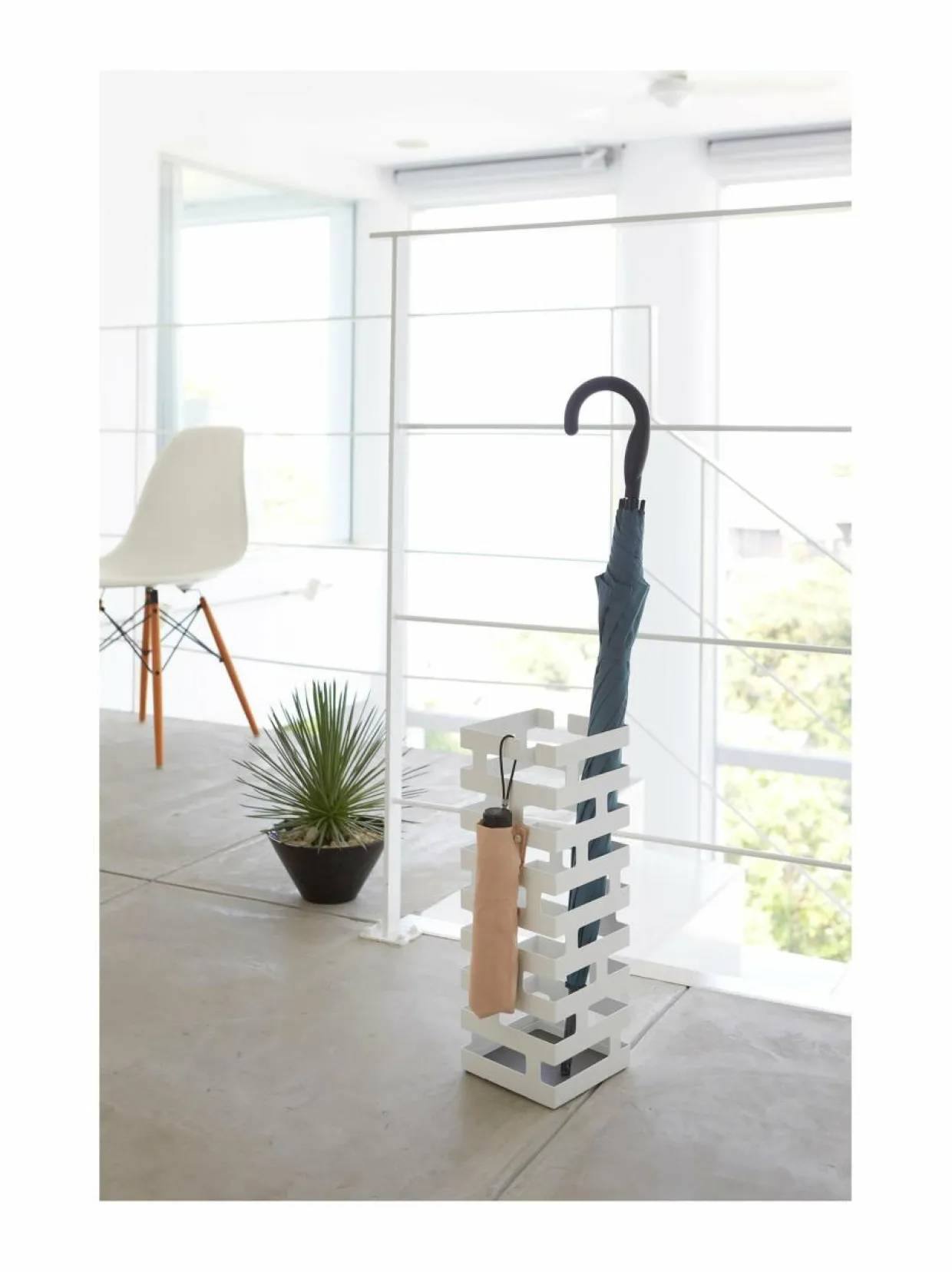 Yamazakin Brick-sateenvarjoteline vie vain vähän tilaa eteisessä, mutta siihen mahtuu jopa 8 sateenvarjoa. Teline on valmistettu mattapintaiseksi maalatusta teräksestä ja sen näyttävä mutta yksinkertainen design sopii monenlaiseen sisustukseen. Suunniteltu Japanissa.