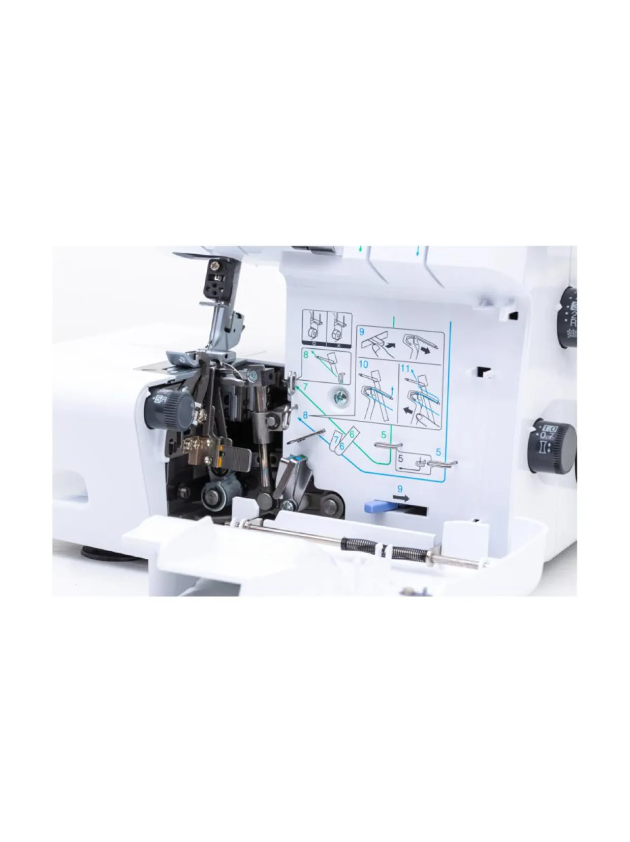 Vapaavarren avulla hihansuuresoreiden kiinnitys sujuu helposti. Saumuria voi käyttää sekä 3- että 4-lankaisena. Langoitus on helppoa, sillä värisymbolit opastavat neula- ja siepparilankojen pujotuksessa.
