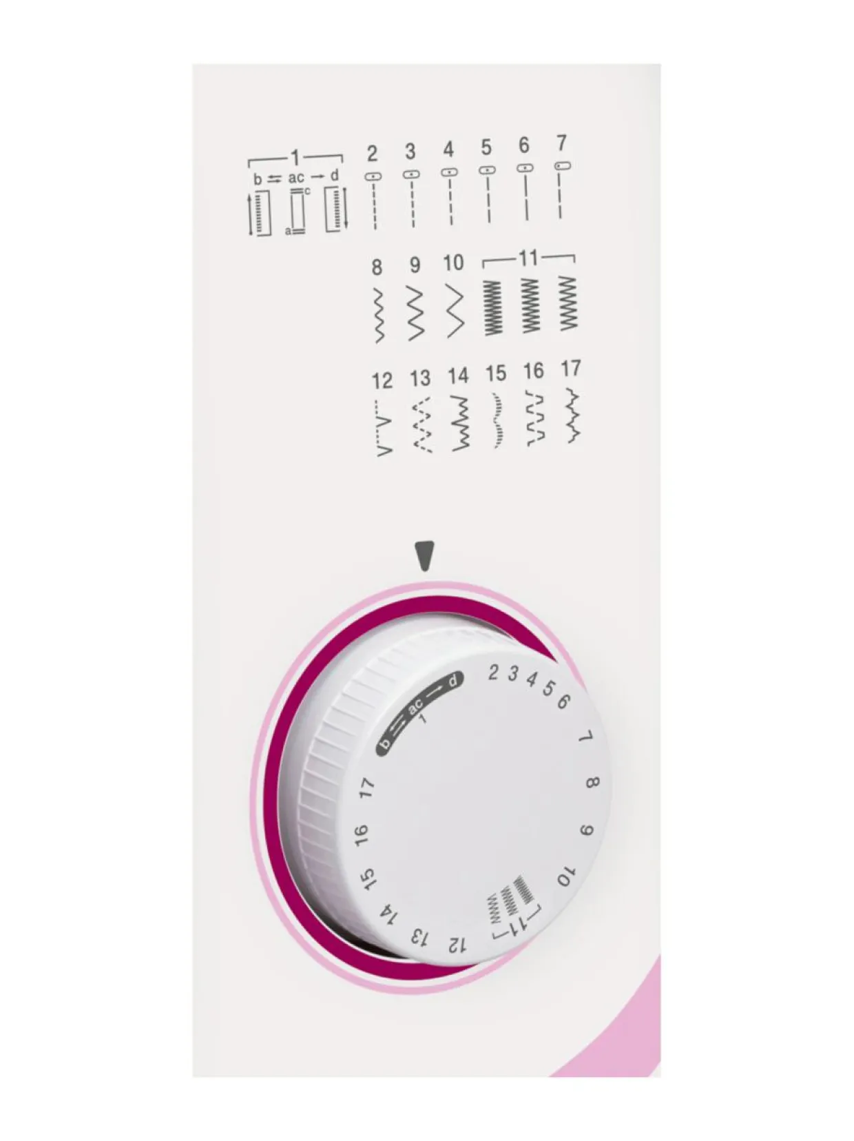 Monipuolinen ja jämäkkä metallirunkoinen ompelukone 17 ompeleen valikoima. Koneessa erikseen säädettävä ompeleen pituus sekä ylälangan kireyden säätö. Helppo ja nopea puolausjärjestelmä. Vapaavarren avulla lyhennät housulahkeet helposti. Nelivaiheisen napinläpiautomatiikan avulla kone ompelee kauniit napinlävet ja oikein suunnattu ja tehokas LED-valo auttaa ompelemaan tarkasti. Läpikuultavan puolakansi auttaa näkemään milloin lanka on loppumassa ja milloin se tulisi vaihtaa. 4kpl pikakiinnitteistä paininjalkaa, joiden avulla ompelet erilaiset napit, kankaat sekä vetoketjut vaivatta.