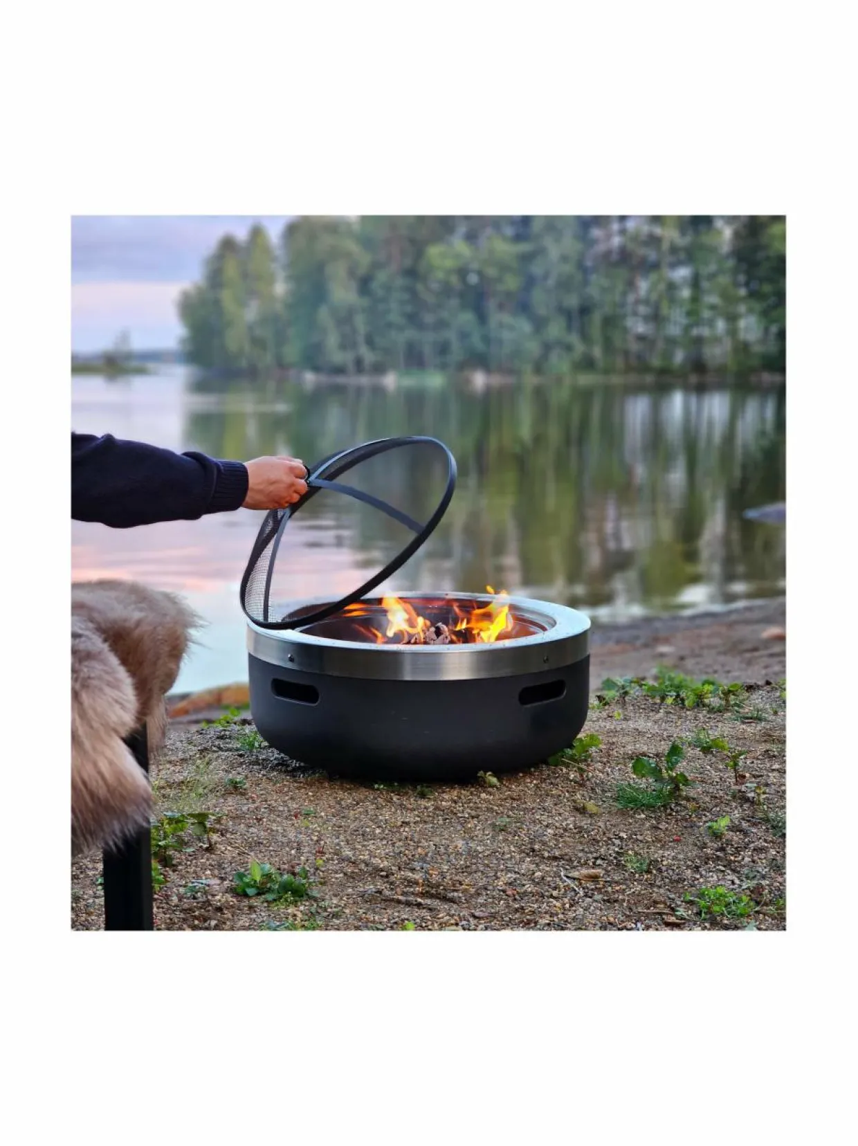 Mustang Burbank Outdoor on moderni, ruostumattomasta teräksestä valmistettu nuotioalusta kipinäverkolla.