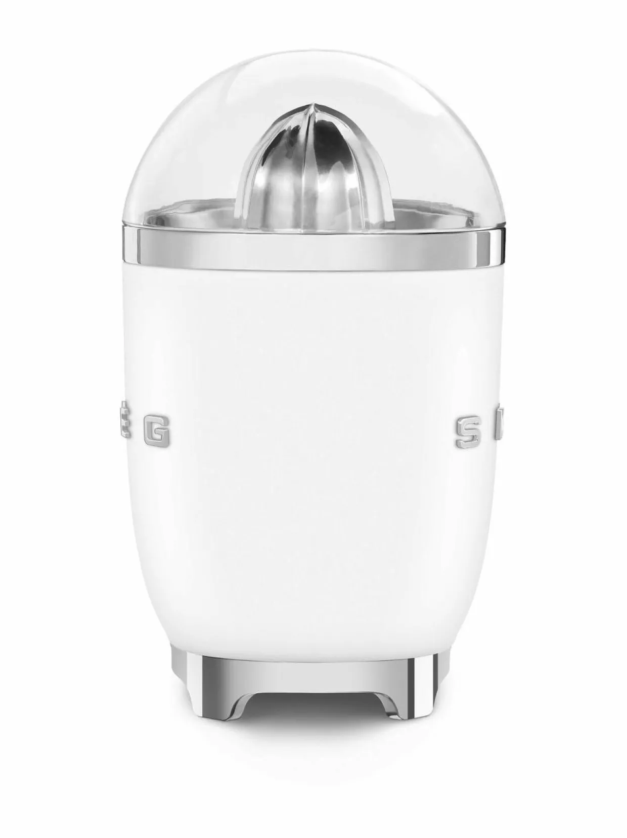 Retrohenkisessä Smeg CJF01 -sitruspuristimessa on tehokas 70 W moottori. Puristin käynnistyy, kun puserrinosa painuu alaspäin. Ruostumattomasta teräksestä valmistettu Anti-Drip-nokka annostelee mehun suoraan lasiin tai kuppiin. Nokan nostaminen yläasentoon keskeyttää virtauksen. Läpinäkyvä tritaanikansi suojaa pölyltä, kun sitruspuristin ei ole käytössä.