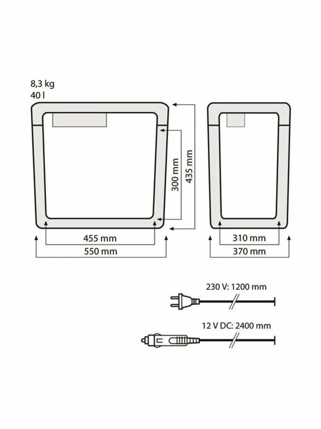 - Kiinteästi asennetut johdot DC/12 V ja AC/230 V tilavassa säilytyslokerossa. Pakkauksessa mukana varasulake 8 A autopistoketta varten. Pese sisäosa: nesteenpoistoa varten pohjassa on tulppa.