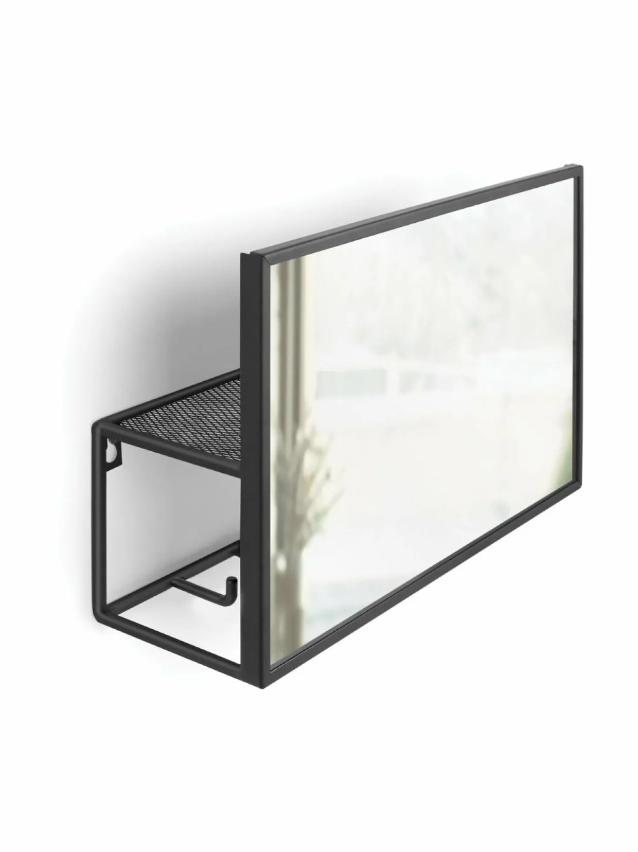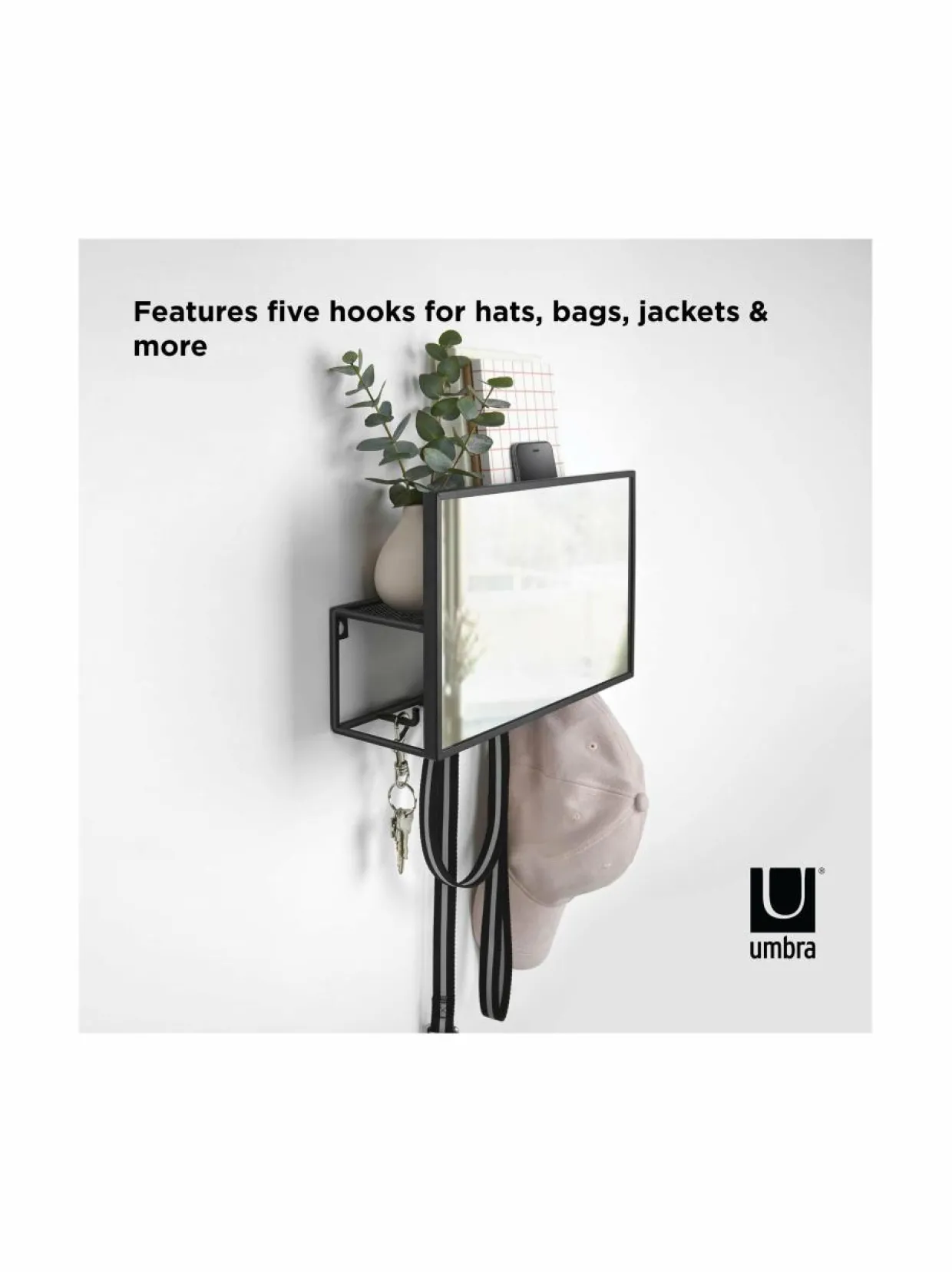 Cubiko Organizer -peilihylly sopii erityisen hyvin eteisen säilytysratkaisuksi. Takana on hylly ja naulakot pienien tavaroiden ja vaatteiden säilytystä varten.