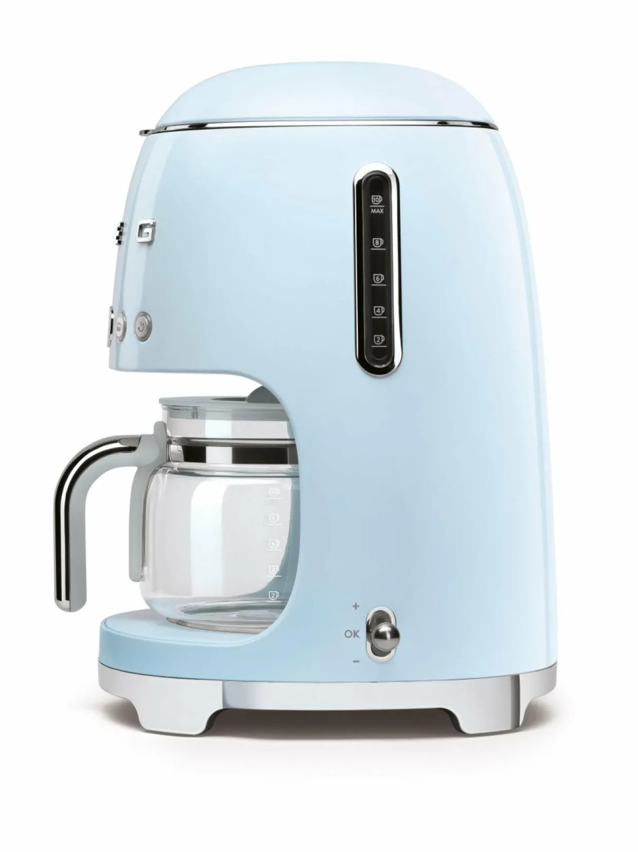 Upeaa retromuotoilua edustava Smeg DCF02PBEU -kahvinkeitin on tyylikäs, taitava ja tehokas keittiöapuri. Selkeällä LCD-näytöllä varustettu keitin keittää jopa 10 kuppia kahvia kerrallaan, ja käytännöllisen aromitoiminnon avulla voit myös valita, kuinka vahvana kahvisi milloinkin haluat. Kahvinkeitin ilmoittaa kahvinkeiton alkamisesta ja kahvin valmistumisesta äänimerkillä ja pitää kahvin lämpimänä vielä 40 minuuttia keittämisestä ilman ylikuumenemisen vaaraa. Lisäksi voit ohjelmoida keittimen käynnistymään automaattisesti haluttuun aikaan. Automaattinen virrankatkaisu ja kalkinpoiston tarpeesta kertova merkkivalo viimeistelevät käyttömukavuuden.