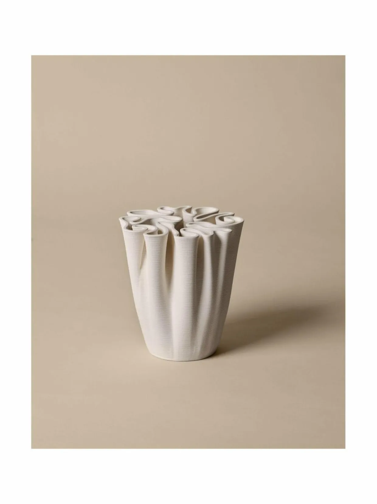 ferm LIVING Dedali on elegantti keraaminen vaasi kauniilla, laskostetulla muotoilulla. Sen ulkopinta on lasittamaton ja sisäpuoli lasitettu. Maljakon 3D-tulostettu rakenne yhdistää taiteen ja käytännöllisyyden, sopien erityisesti pienille kukka-asetelmille Ikebana-tyyliin. Mitat 15 x 18 cm.
