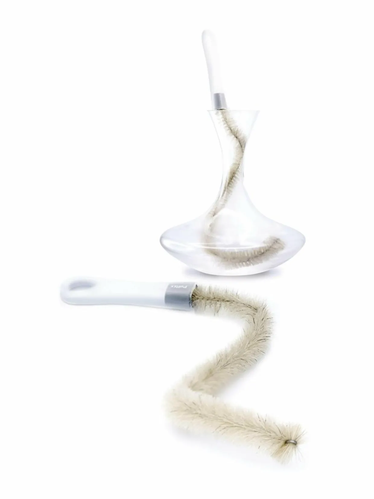 Joustava dekantterin puhdistusharja ylettää pullon jokaiseen kolkkaan, sinnekin, minne tavallisella harjalla on mahdotonta päästä. Voidaan pestä astianpesukoneessa.