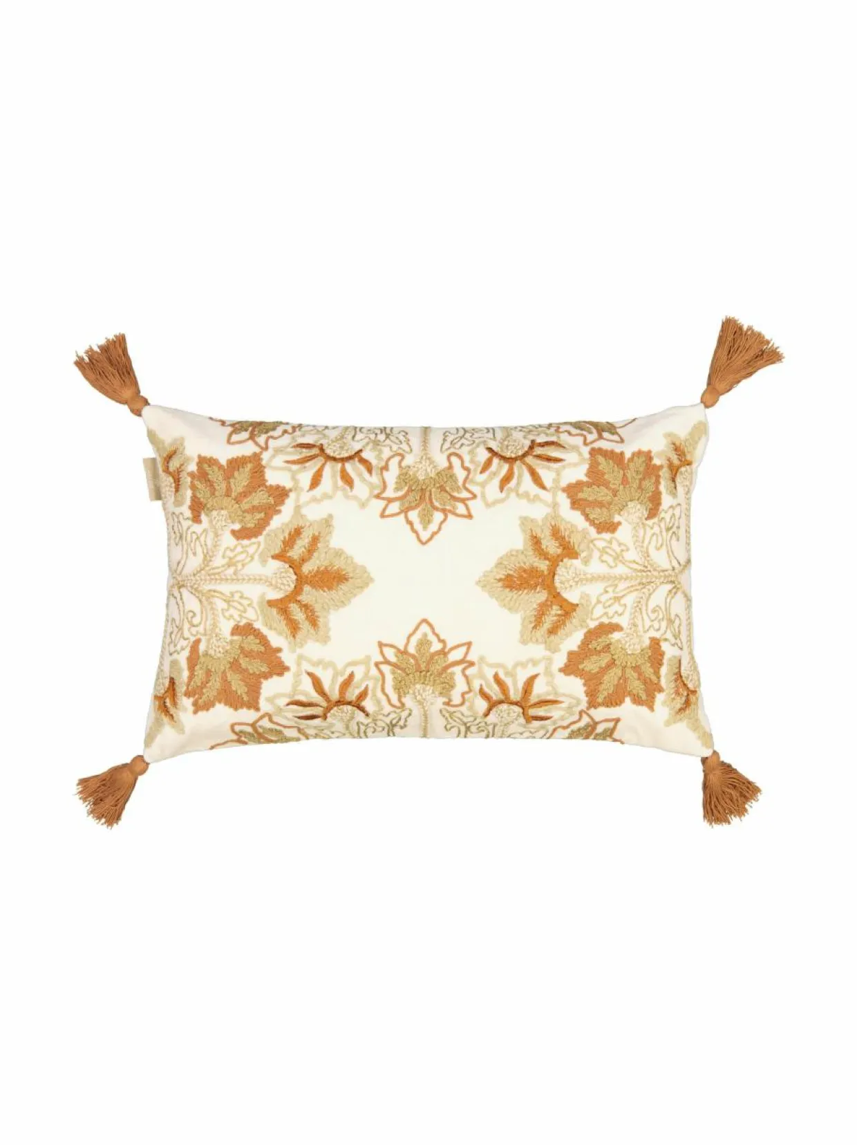 Villa Stockmannin Delft-tyynynpäällinen tuo kotiisi ylellistä ja eksoottista tunnelmaa. Tämä 30 x 50 cm kokoinen tyynynpäällinen on valmistettu pehmeästä puuvillasametista. Kauniit brodeeratut kuviot ja tyynynpäällisen neljässä kulmassa olevat koristeelliset tupsut lisäävät siihen persoonallisuutta ja tekevät siitä huomiota herättävän sisustuselementin.