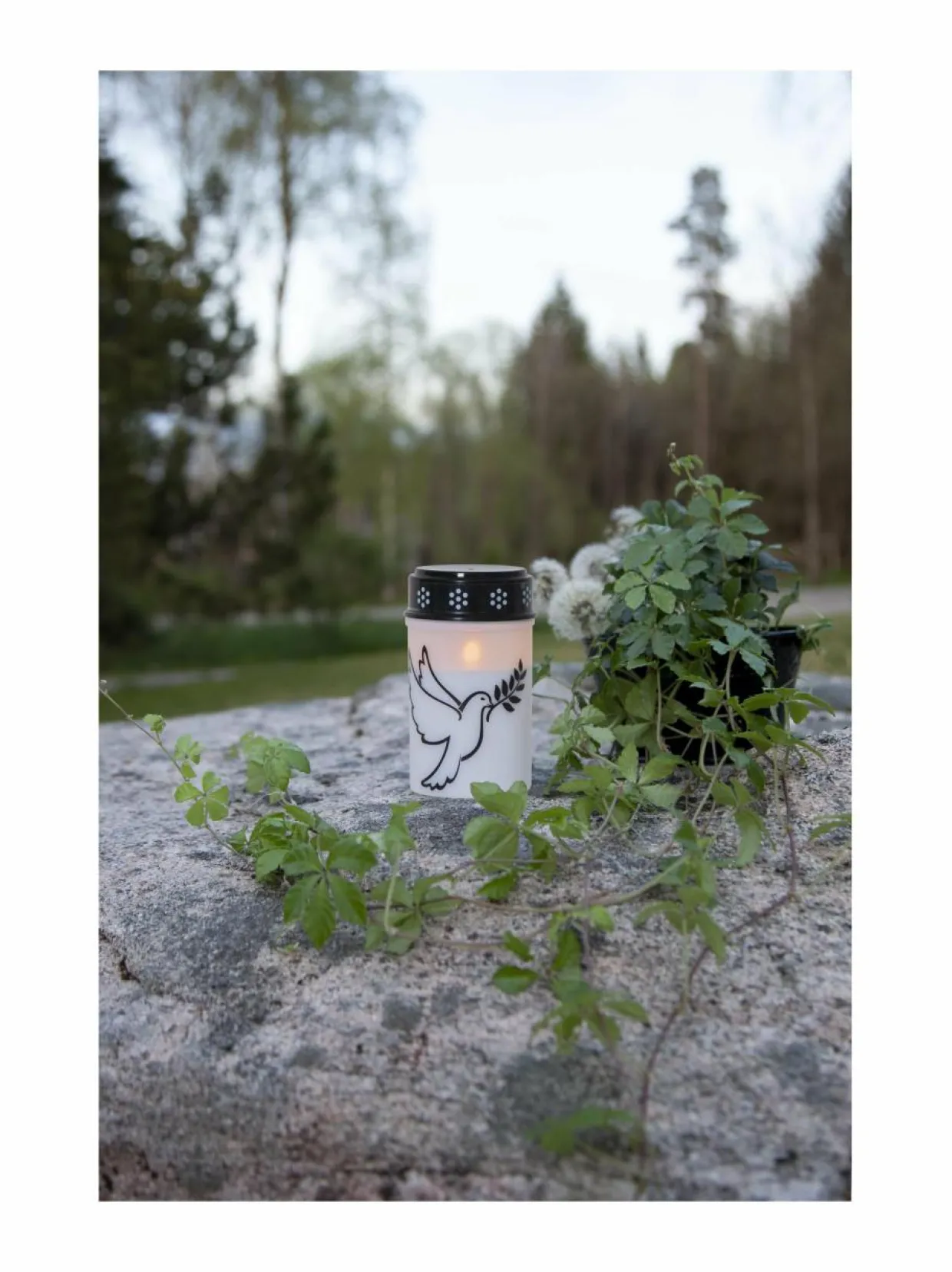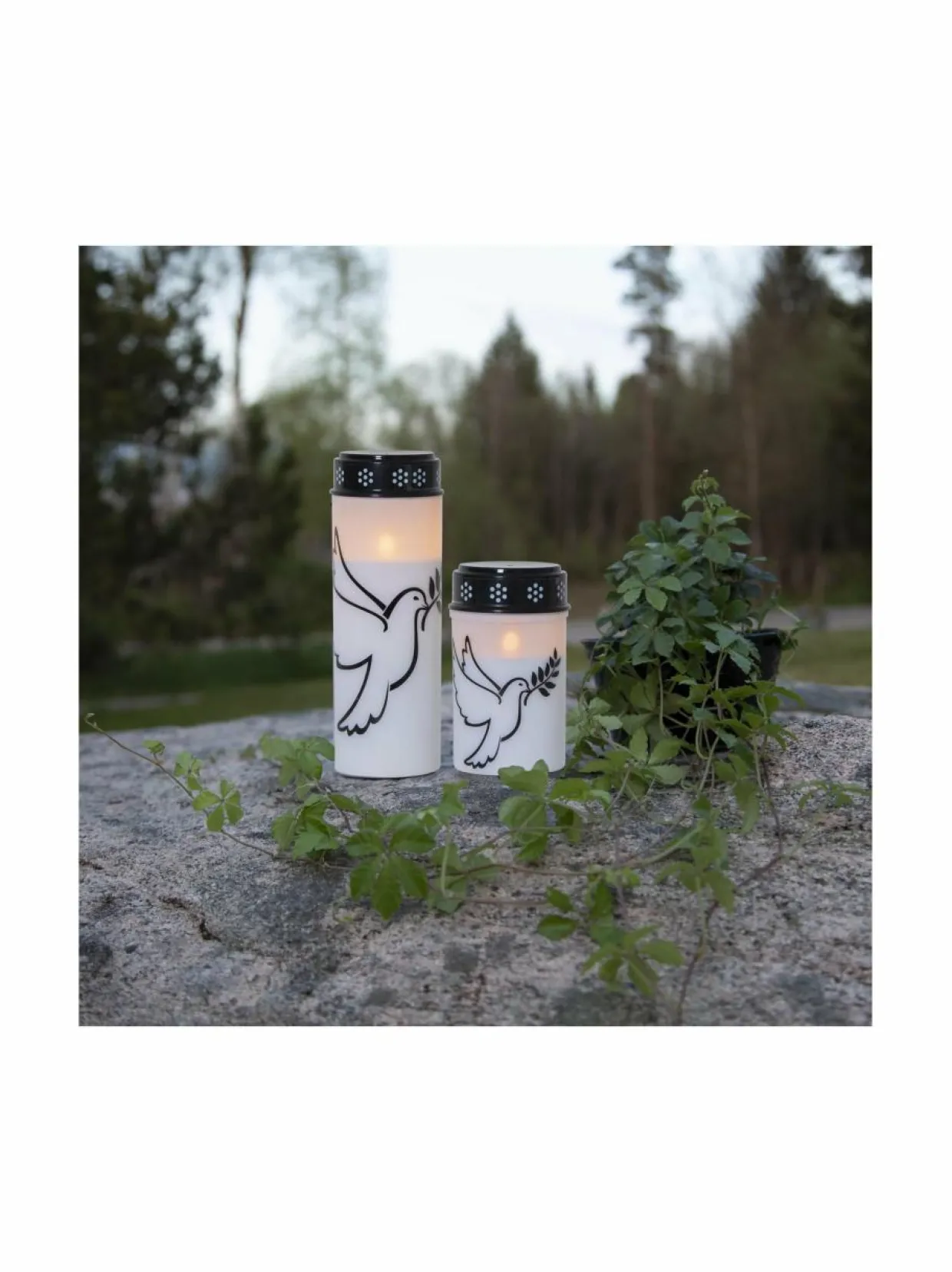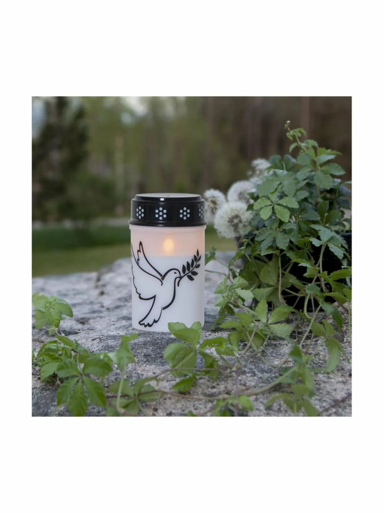 LED-hautakynttilä, jossa on kuva lentävästä kyyhkysestä ja liekissä lämpimän valkoinen valo. Ajastintoiminnon avulla kynttilä palaa 6 tunnin ajan kerrallaan ja syttyy seuraavana päivänä samaan aikaan uudelleen. Kynttilä toimii kahdella C-paristolla, jotka eivät sisälly pakkaukseen. Paristokesto jopa 2500 tuntia. Halkaisija 7,5 cm ja korkeus 12,5 cm. Kiinteä LED, lamppua ei voi vaihtaa. Sopii ulkokäyttöön.