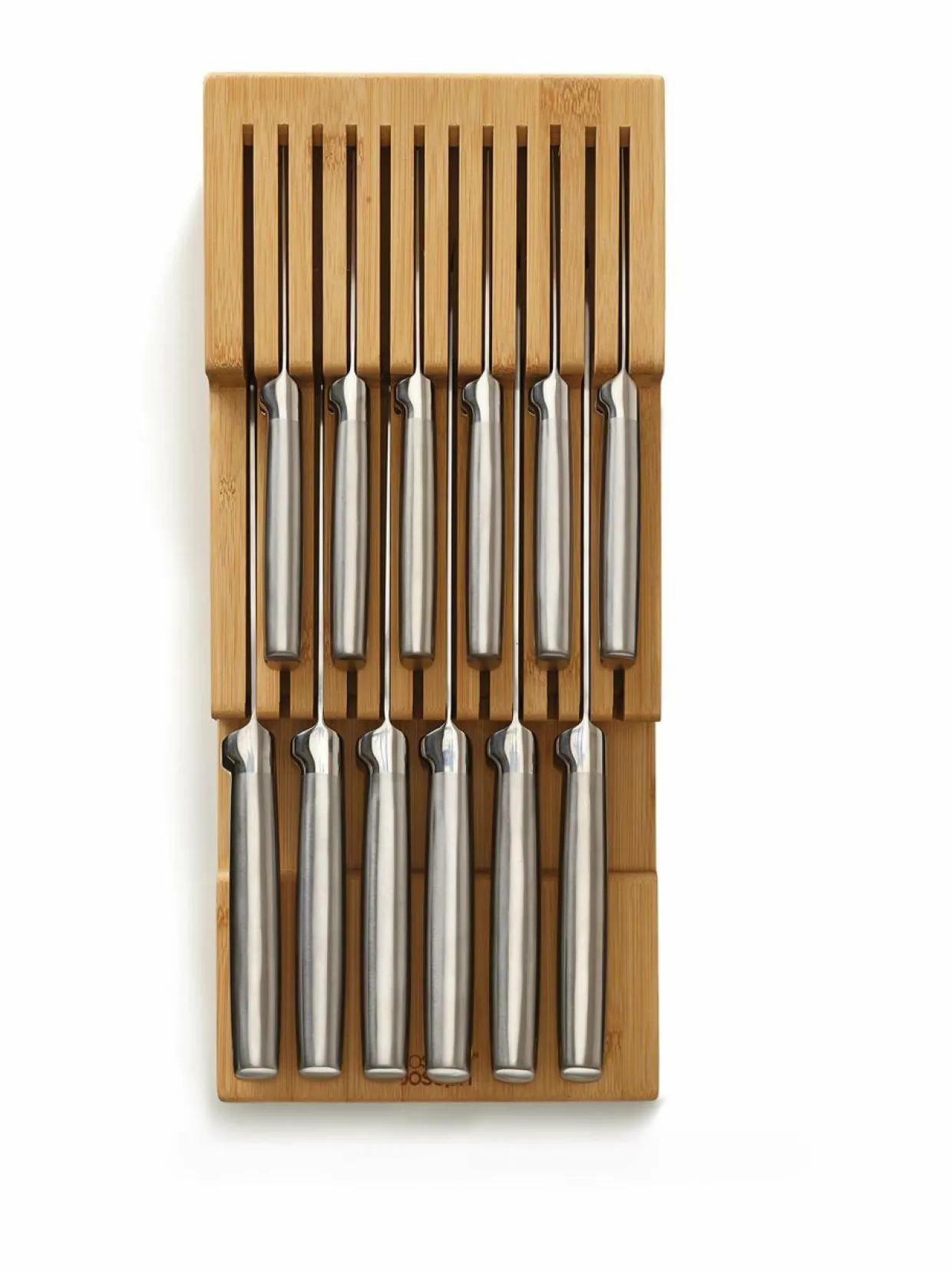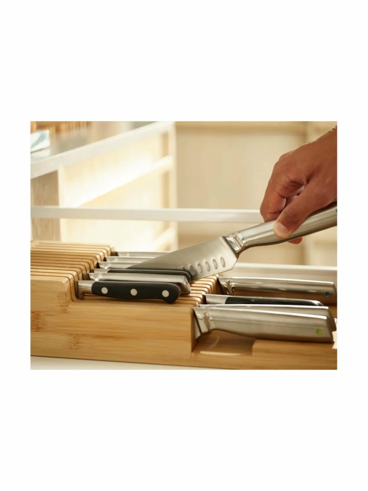 Terävien veitsien löysä säilyttäminen laatikoissa voi olla vaarallista ja voi myös vahingoittaa kalliita teriä. Tämä 2-kerroksinen veitsijärjestäjä on täydellinen ratkaisu, joka tarjoaa sekä turvallisen säilytyksen että helpon pääsyn useille keittiöveitsille. Siinä on kaksi tasoa eri pituuksille ja mahtuu jopa kaksitoista veistä siistiin, kompaktiin tilaan. Pohjassa olevat liukumattomat jalat estävät laitetta liukumasta laatikossasi.