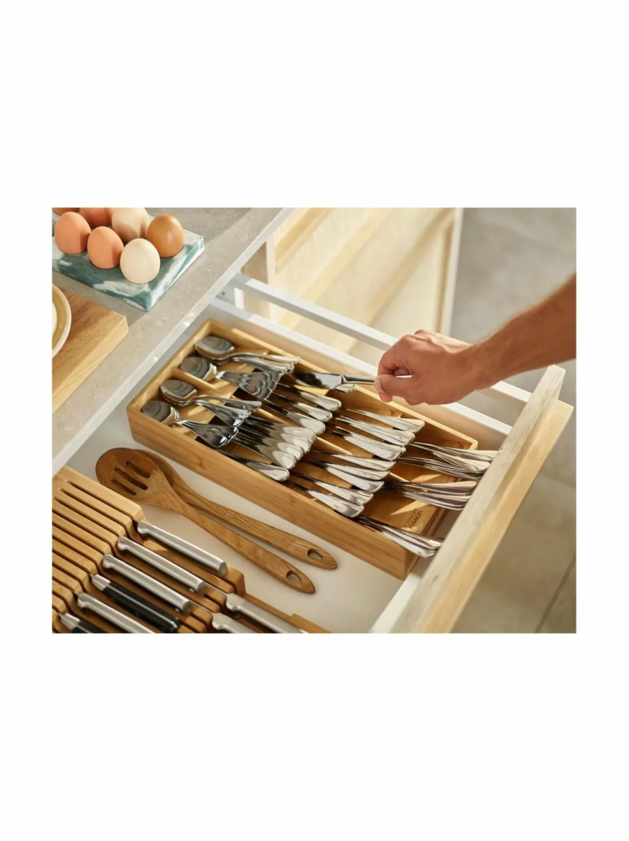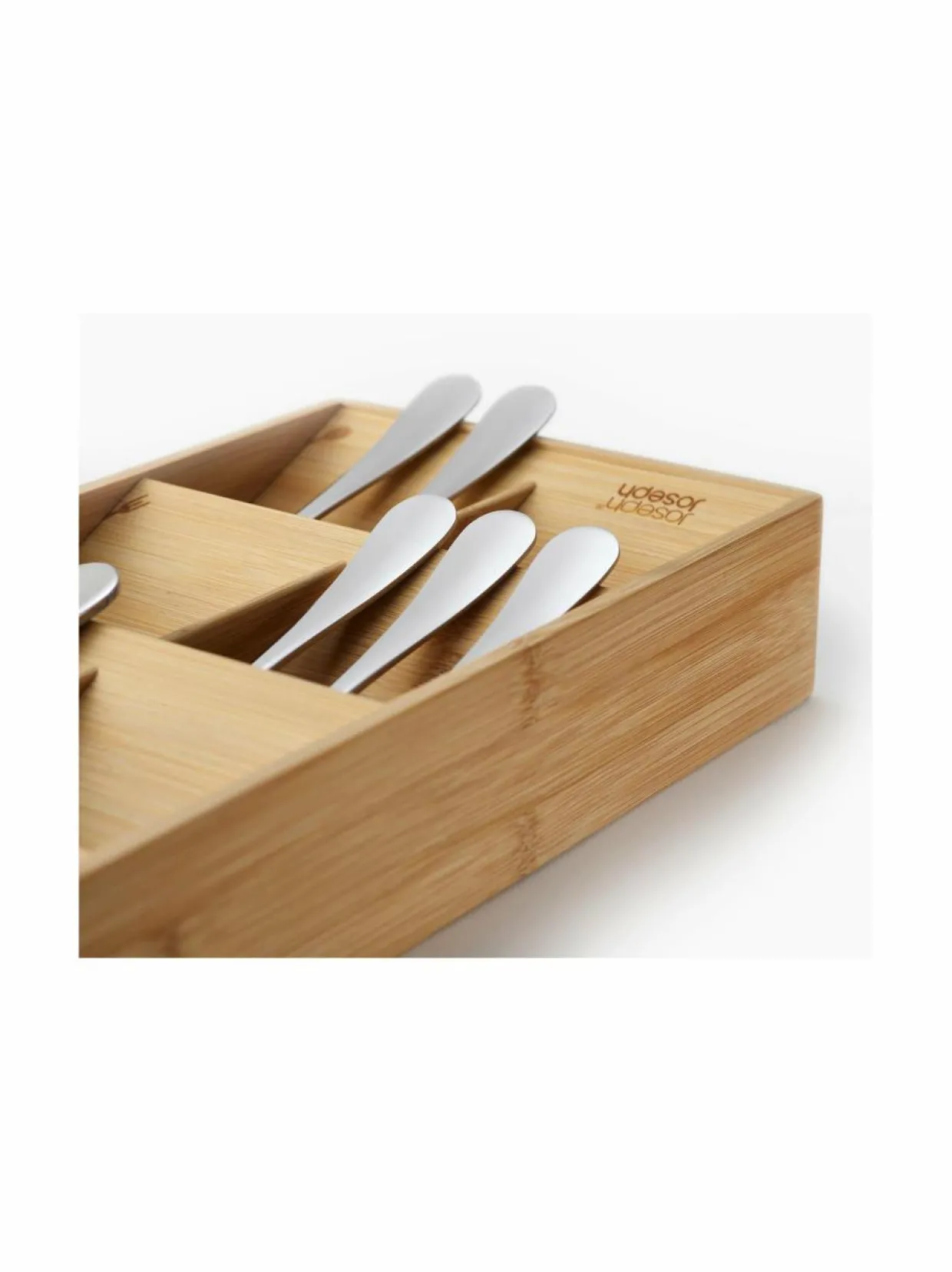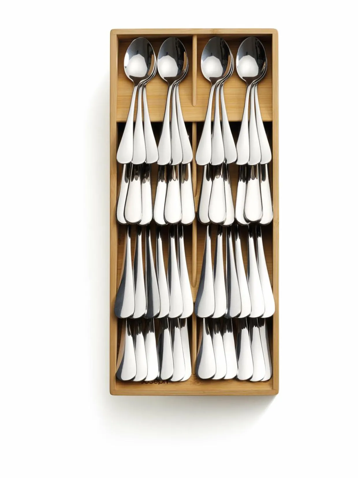 Joseph Josephin aterinlokerikko uniikilla muotoilulla on järkevä säilytysratkaisu ruokailuvälineille. Kompaktissa laatikossa aterimet pysyvät siistissä järjestyksessä tilaa säästäen. Valmistettu luonnollisesta bambusta. Teline pysyy hyvin paikallaan liukumattoman pohjan ansiosta.