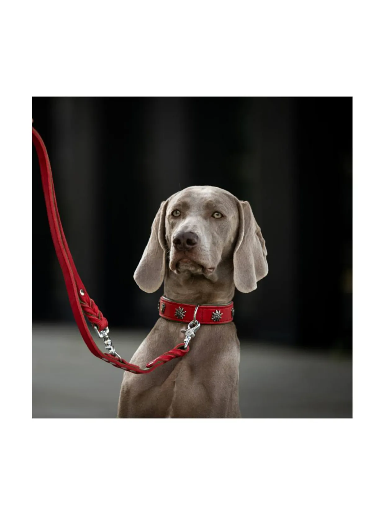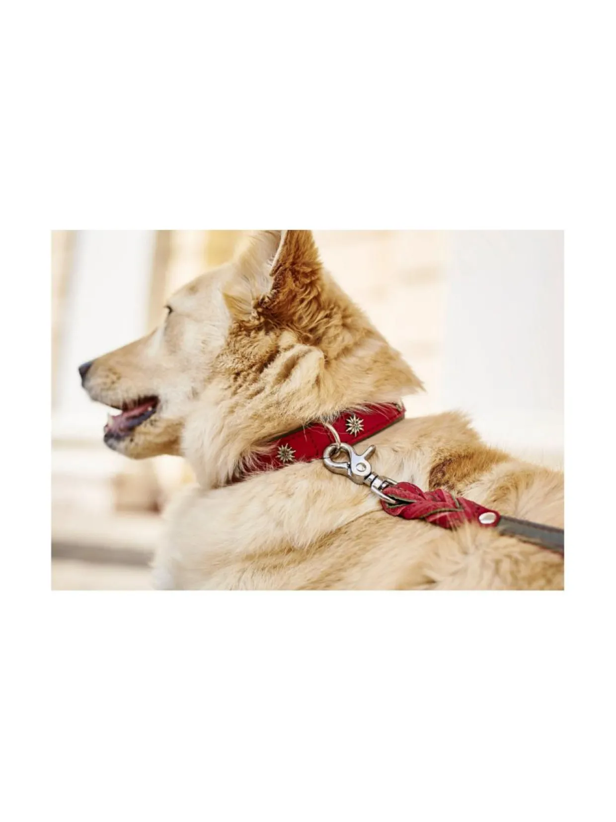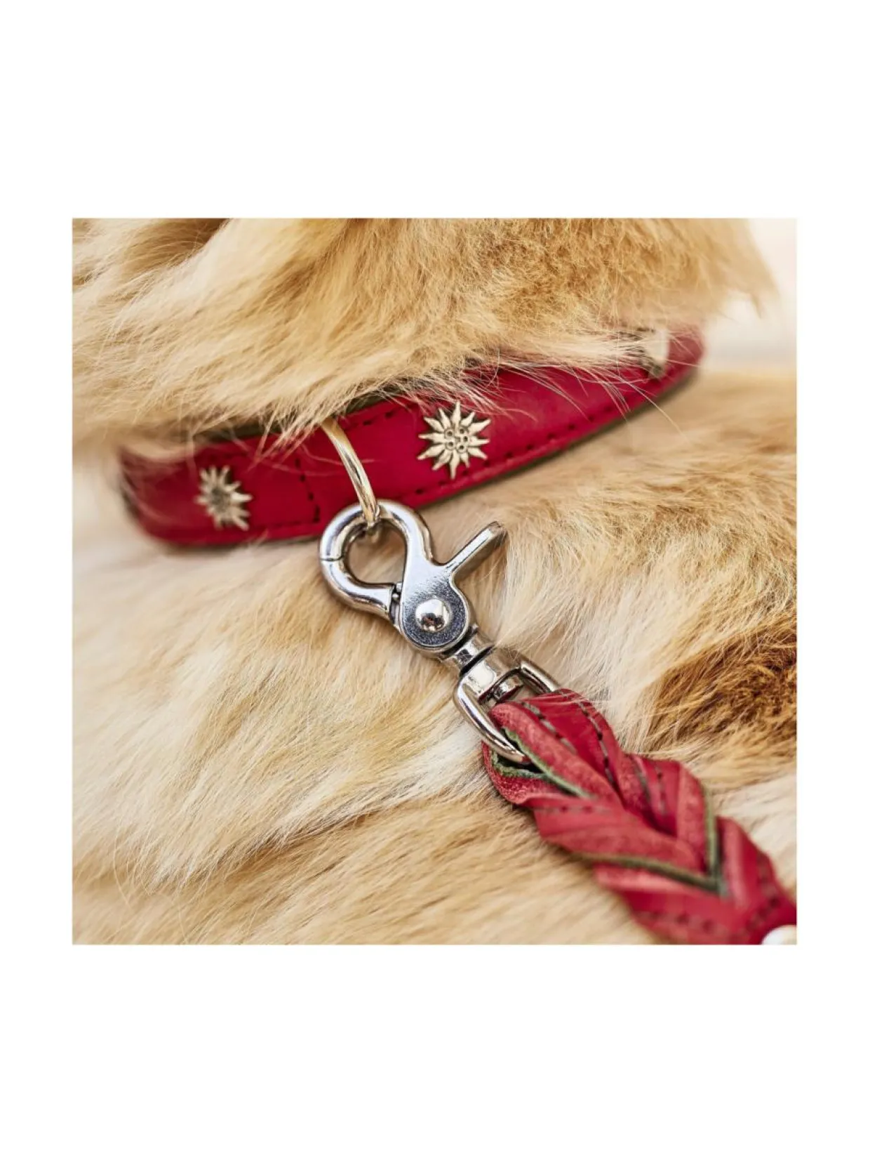 Upeassa punaisessa pannassa on täydelliset saumat, laadukkaat kiinnikkeet sekä kiinteä karbiini takaamassa turvallisuutta. Pyöreä, ommeltu, 3-suuntaisesti säädettävä talutushihna tarjoaa erityisen pehmeän tunteen taluttaessa. Vahvan ompelun lisäksi hihnan ydin on vahvistettu nailonilla lisäämään kestävyyttä. Kaulaa vasten olevan alapuolen samettisen pehmeä nupukkinahka sopii hyvin myös herkille koirille.