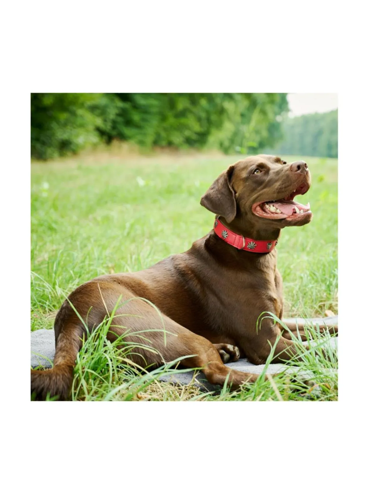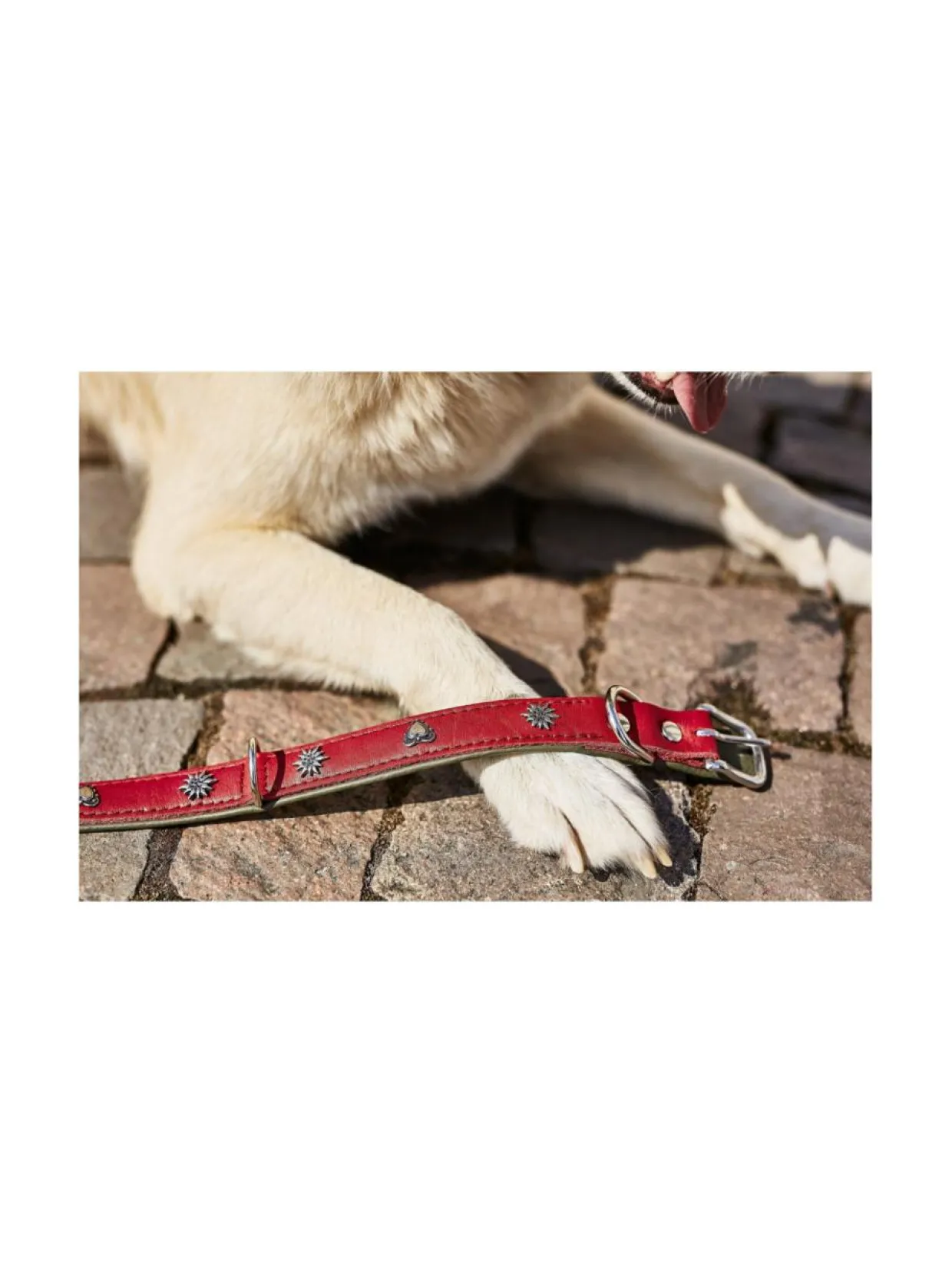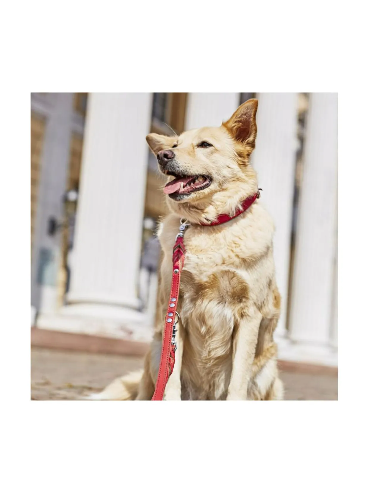 Upeassa punaisessa pannassa on täydelliset saumat, laadukkaat kiinnikkeet sekä kiinteä karbiini takaamassa turvallisuutta. Pyöreä, ommeltu, 3-suuntaisesti säädettävä talutushihna tarjoaa erityisen pehmeän tunteen taluttaessa. Vahvan ompelun lisäksi hihnan ydin on vahvistettu nailonilla lisäämään kestävyyttä. Kaulaa vasten olevan alapuolen samettisen pehmeä nupukkinahka sopii hyvin myös herkille koirille.