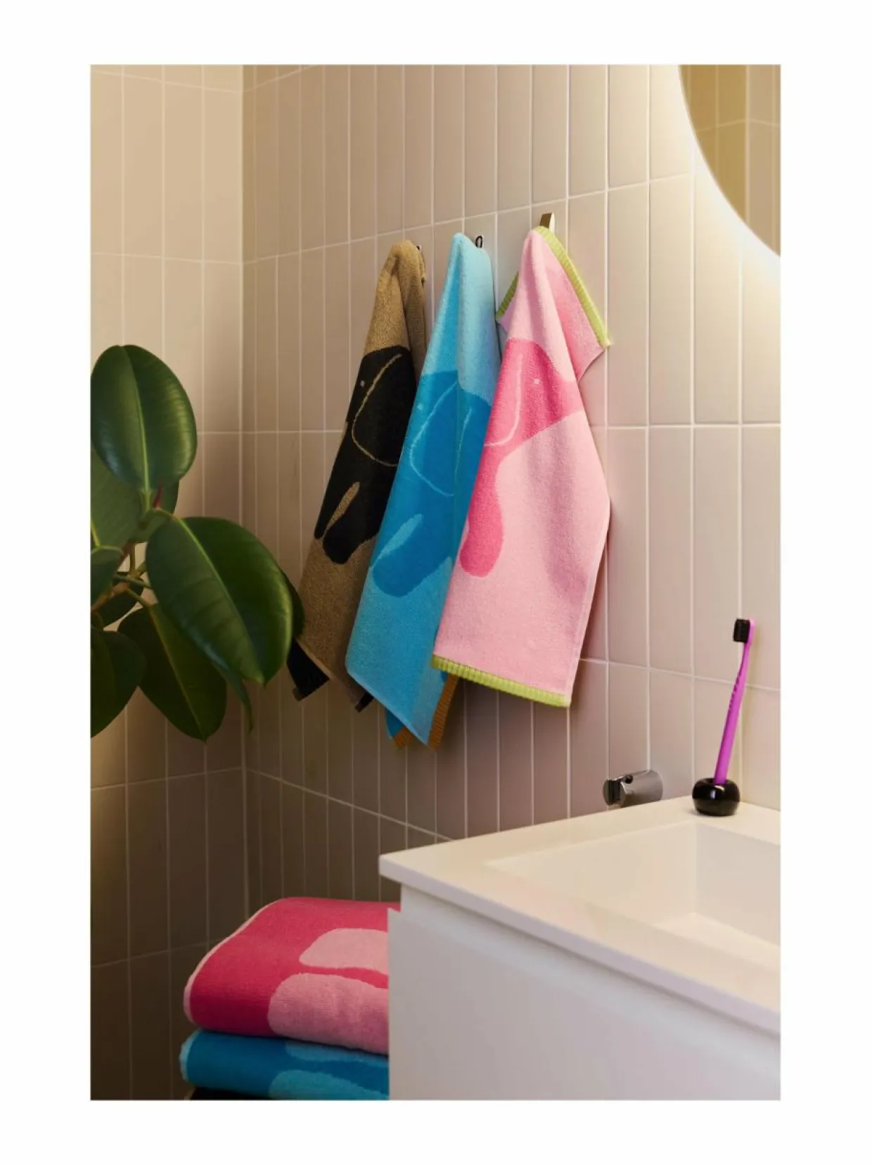 Värikkäissä Elefantti vapaa -pyyhkeissä komeilevat muhkeat elefantit, jotka ovat lähteneet seikkailemaan suureen maailmaan. Pientä käsipyyhettä koristaa yksi norsuhahmo, muissa pyyhkeissä norsut esiintyvät pareittain. Toinen fanteista suhtautuu tilanteeseen tyynesti, villimpi on nostanut kärsänsä pystyyn ja töräyttää vapauden riemuhuudon.