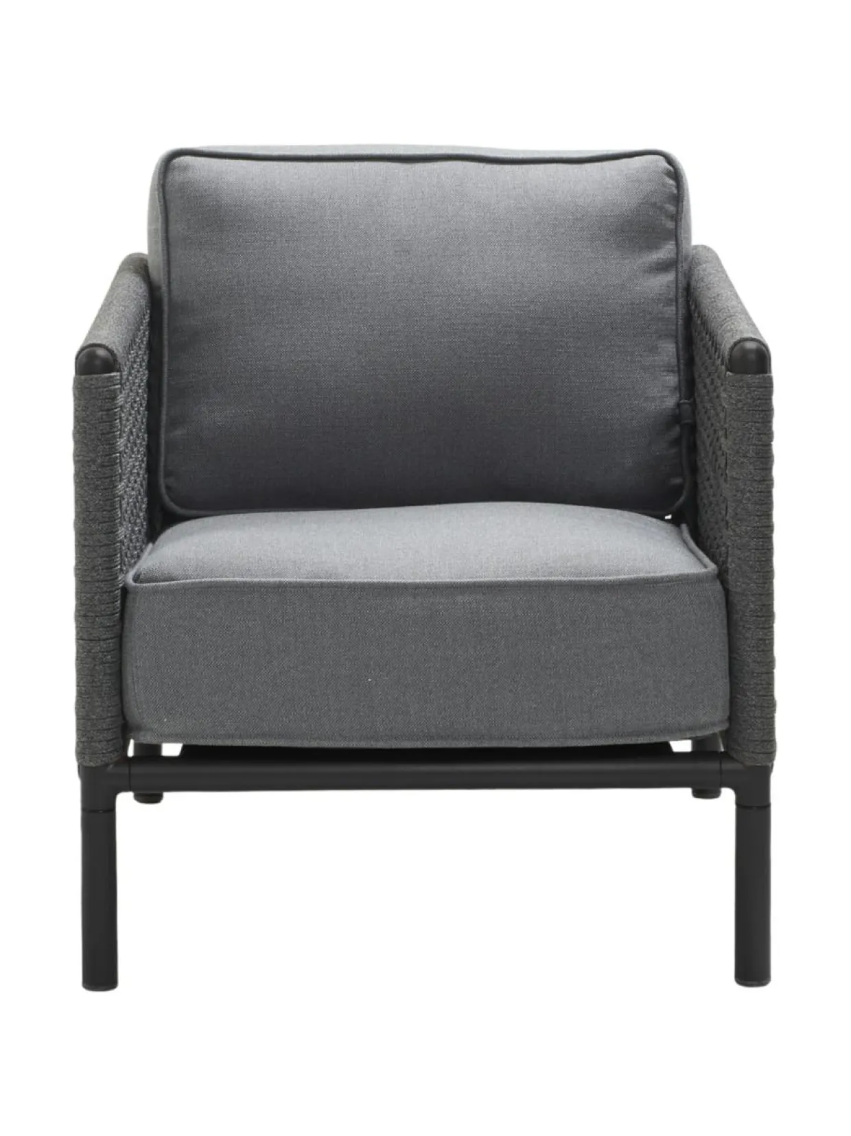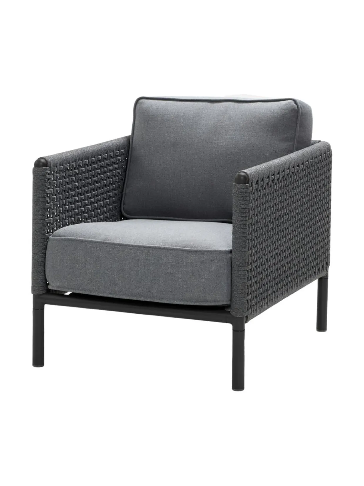 Encore-nojatuoli ulkokäyttöön. 71 cm lev, 91 syv, 78 kork, 43 istuinkork. Istuintyynyt sisältyvät hintaan, harmaa Cane-line AirTouch -kangas. Alumiinirunko, tumma harmaa Cane-line Soft Rope -punos.