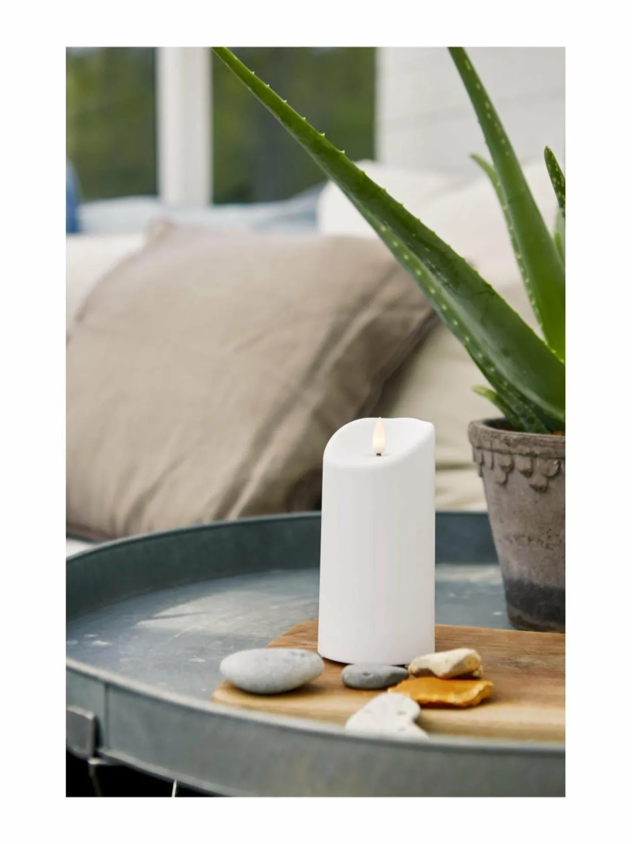 Valkoinen muovista valmistettu LED-kynttilä, joka sopii sekä sisä- että ulkokäyttöön. Kynttilässä on kaunis luonnollisen näköinen liekki lämpimän valkoisella valolla. Ajastintoiminnon avulla valo palaa 6 tunnin ajan kerrallaan ja syttyy seuraavana päivänä samaan aikaan uudelleen. Kynttilä toimii kahdella AA-paristolla, jotka eivät sisälly pakkaukseen. Halkaisija 7,5 cm ja korkeus 15 cm. Kiinteä LED, lamppua ei voi vaihtaa. IP44 -luokitus.