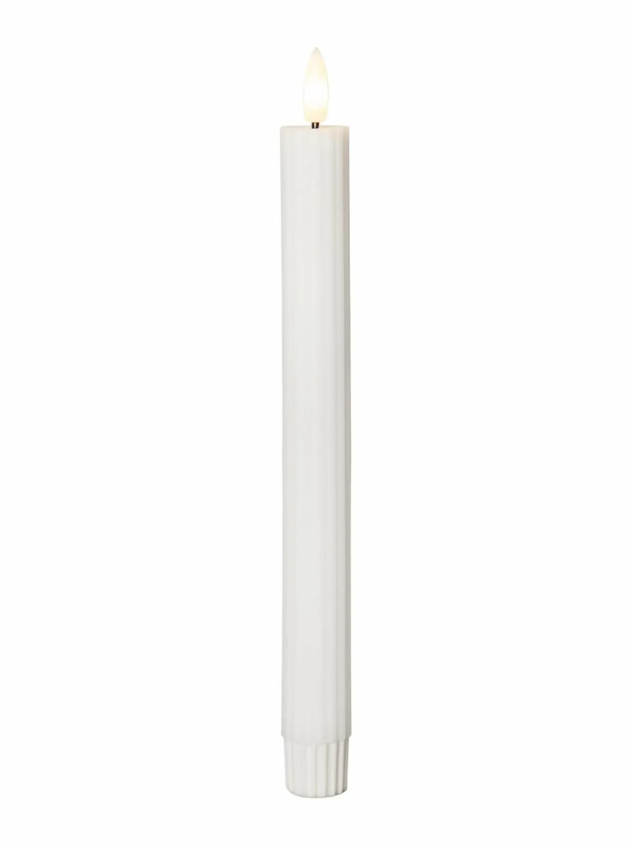 Valkoinen vahasta valmistettu antiikkikynttilä sisäkäyttöön. Kynttilöissä on uritettu pinta ja kaunis luonnollisen näköinen liekki lämpimän valkoisella valolla. Kynttilät toimivat kumpikin kahdella AAA-paristolla, jotka eivät sisälly pakkaukseen. Ajastintoiminnon avulla valo palaa 6 tunnin ajan kerrallaan ja syttyy seuraavana päivänä samaan aikaan uudelleen. Pakkaus sisältää kaksi kynttilää.