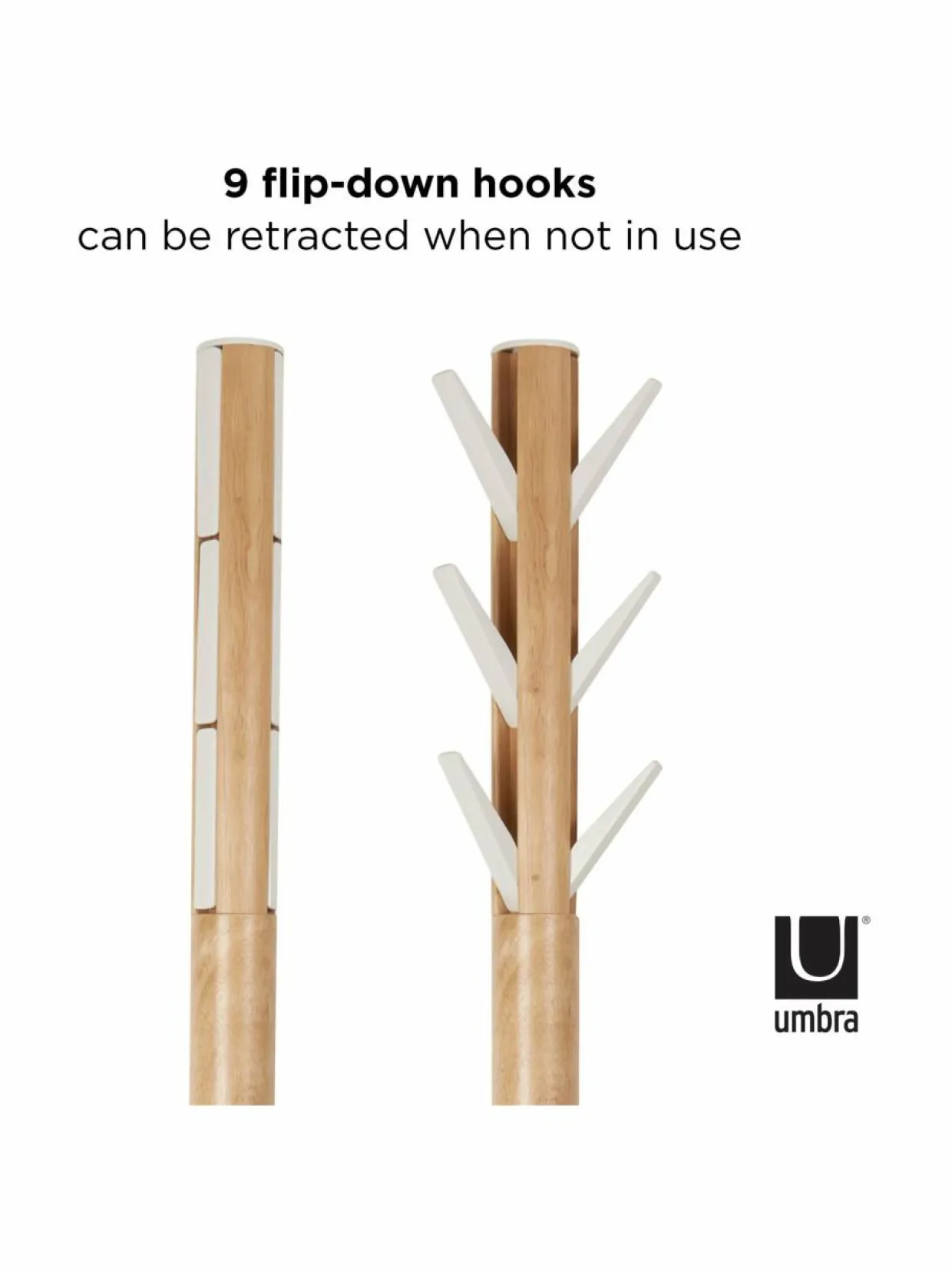 Tukevassa kumipuisessa naulakossa on yhdeksän pelkistetyn tyylikästä metallikoukkua, jotka toimivat ripustimina. Metallikoukut voidaan kääntää huomaamattomasti kiinni naulakkoa vasten, kun niitä ei käytetä. Modernissa naulakossa on yhdeksän alumiinista koukkua sekä vakaa, kumipuinen runko.