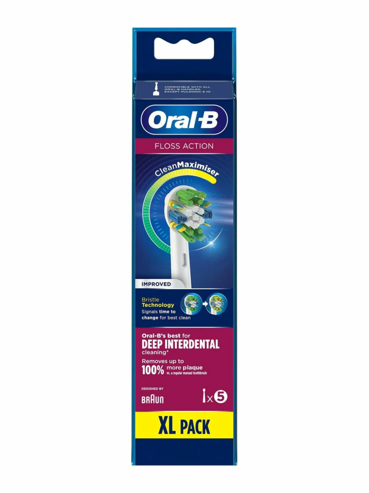 FlossAction kuuluu Oral-B:n premium-vaihtoharjoihin ja sen erityiset plakkia irrottavat MicroPulse-harjakset poistavat jopa 100 % enemmän plakkia tavalliseen käsikäyttöiseen hammasharjaan verrattuna. Oral-B:n parannellut FlossAction-vaihtoharjat sisältävät CleanMaximiser-tekniikan, joka saa harjakset vaihtamaan väriä vihreästä keltaiseen, kun on aika vaihtaa vaihtoharjaa. Ainutlaatuisen pyöreän harjaspään harjakset ulottuvat syvälle hammasväleihin ja kattavat hampaan pinnan optimaalisesti. Yhteensopiva kaikkien Oral-B-runko-osien kanssa, poikkeuksena Pulsonic ja iO.