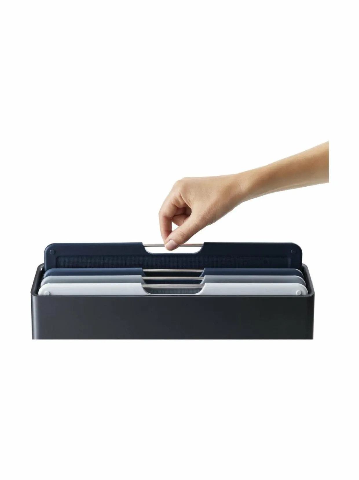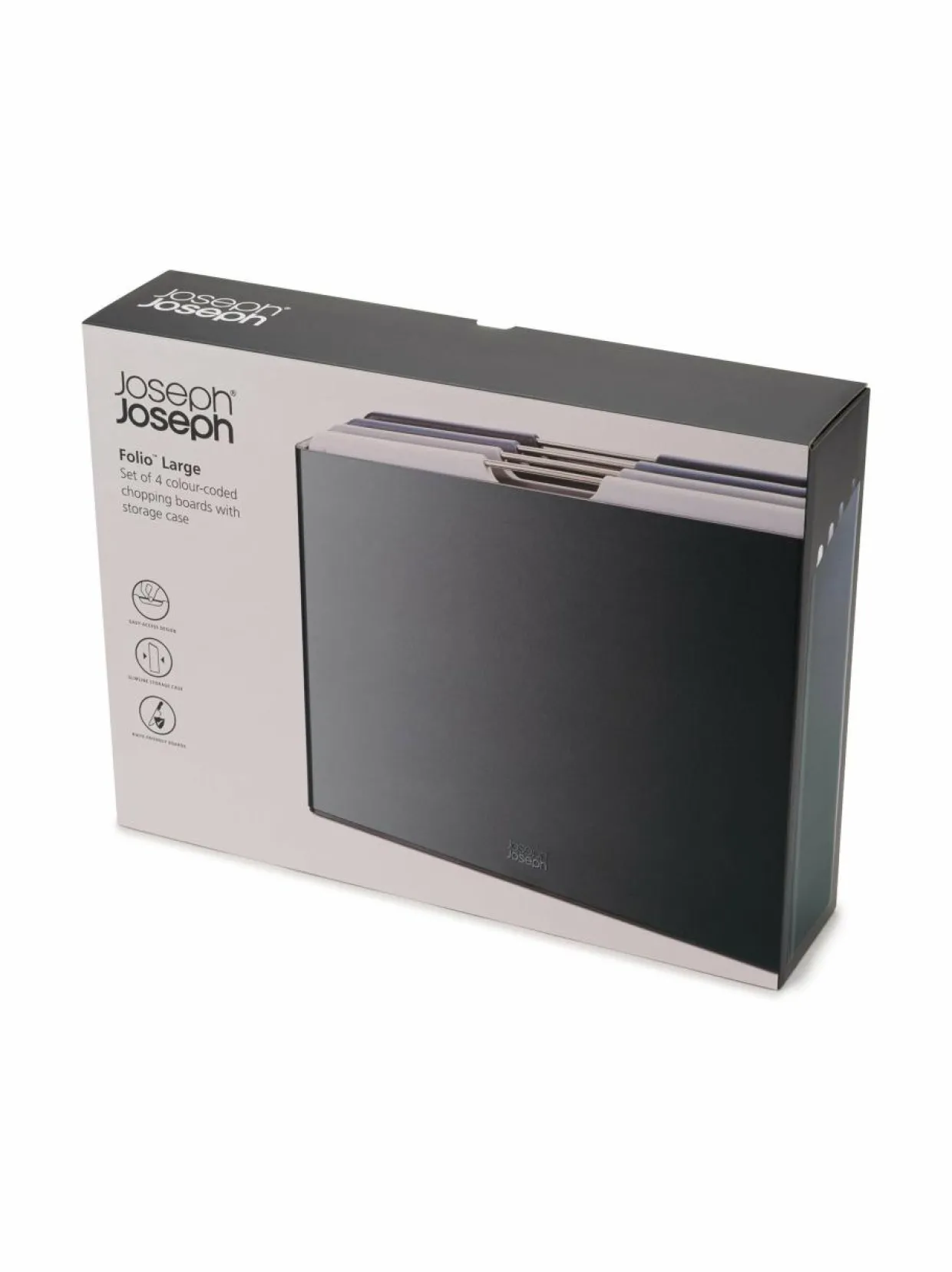 Joseph Josephin Folio-leikkuulaudat pysyvät tyylikkäässä telineessä siistissä järjestyksessä ja kuivuvat ilmavasti ja tasaisesti. Leikkuulaudat on helppo nostaa telineestä ruostumattomasta teräksestä valmistetusta kahvasta. Pakkauksessa on neljä leikkuulautaa, joissa on luistamaton pohja ja veitselle soveltuva pinta.