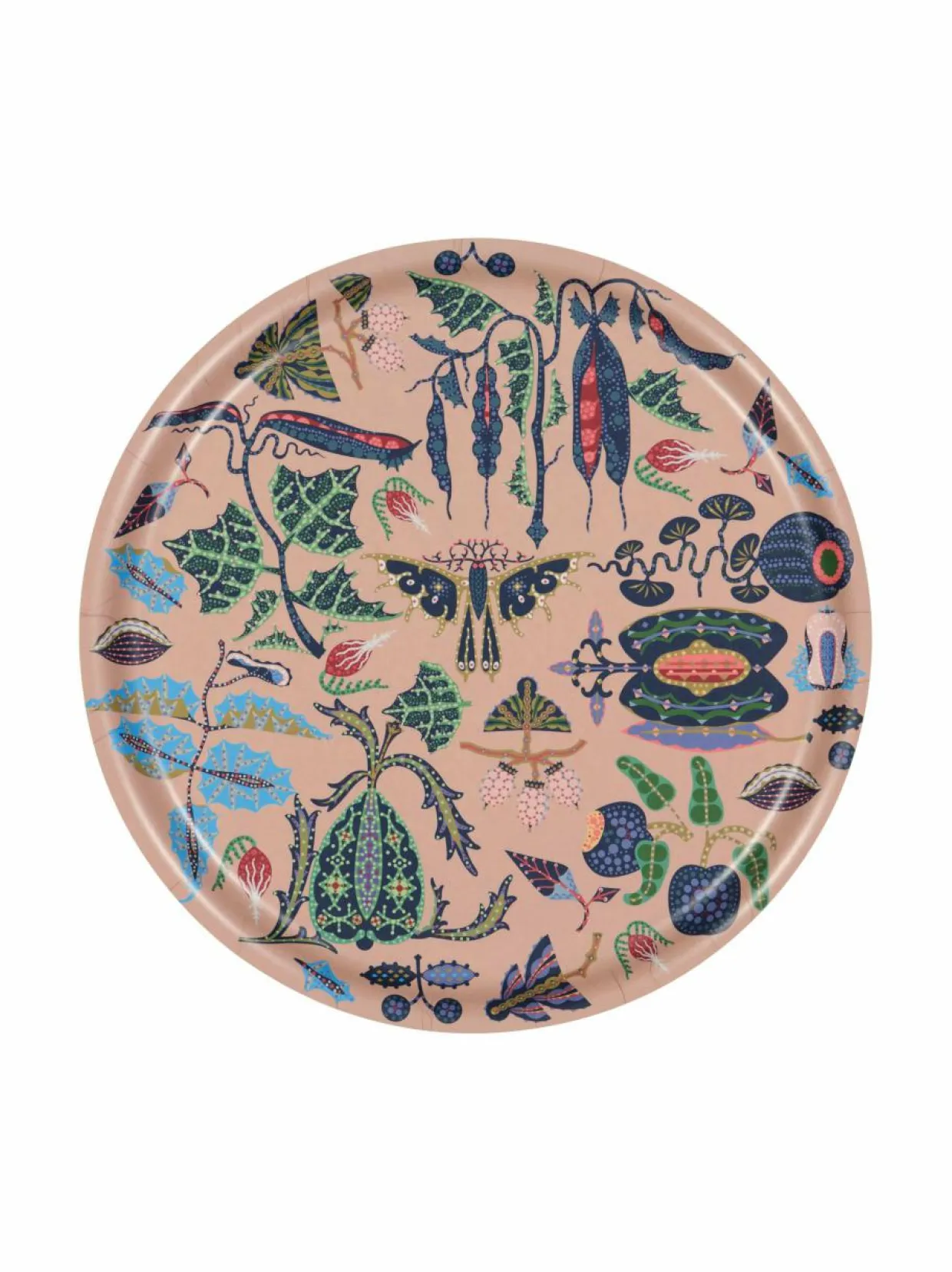 Pyöreä laminoitu koivuviilutarjotin Fruits-kuviolla. Tarjotin ilahduttaa niin keittiön apuvälineenä kuin koristeena