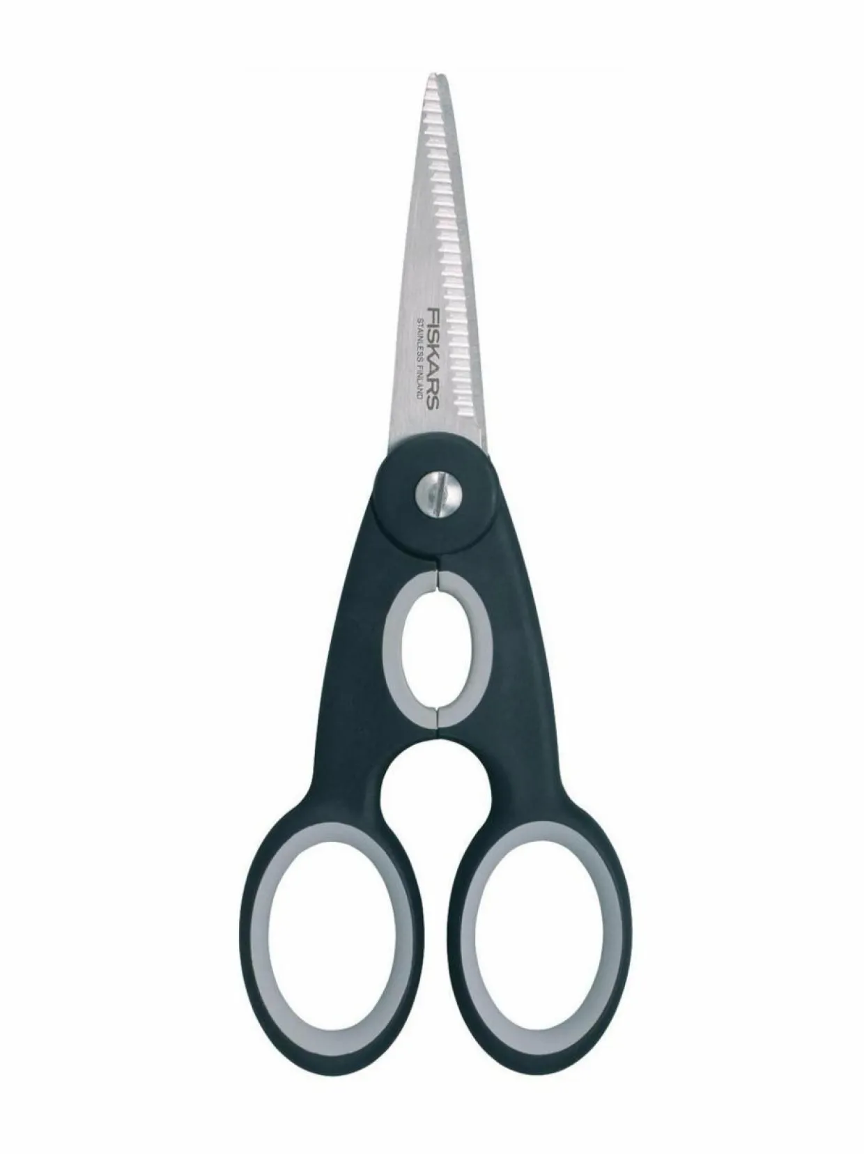 Functional Form -keittiösaksissa on kestävä ja terävä hammastettu alaterä ja luistamattomat Softouch®-kädensijat. Kahvojen välissä olevalla renkaalla avaat näppärästi myös kierrekorkit.