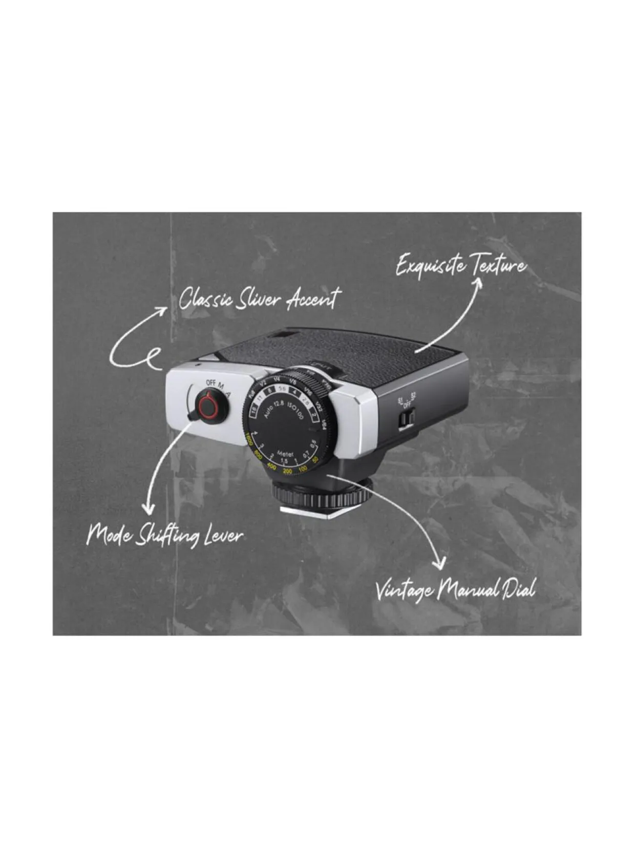 Nykyaikainen salama 80-luvun muotoilulla. Tämän salamavalon idea on pitää kuvaaminen mukavan simppelinä. Asetetaan sopiva toiminto päälle ja aletaan kuvaamaan, diginä tai filmikameralla.