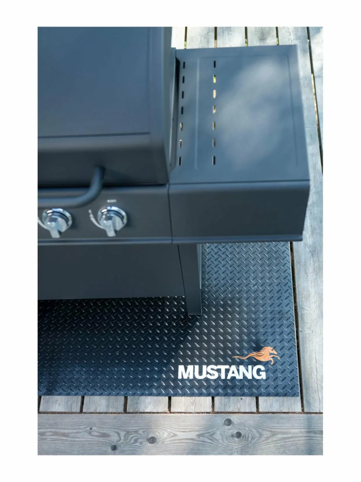 Kätevä grillimatto Mustang merkin logolla. Se on käytännöllinen ja kestävä matto, joka suojaa terassia grillistä tippuvilta rasvoilta ja kipinöiltä.