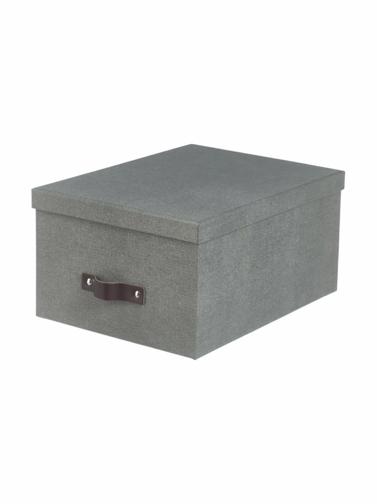 Bigso Boxin hillittyyn laatikkoon voi säilöä lehtiä, askartelutarvikkeita tai vaikkapa leluja. Gustav-säilytyslaatikko sopii tyylikkäästi avohyllyiseen kirjahyllyyn. Kätevästä nahkaisesta kahvasta laatikon voi vetää hyllystä esiin.