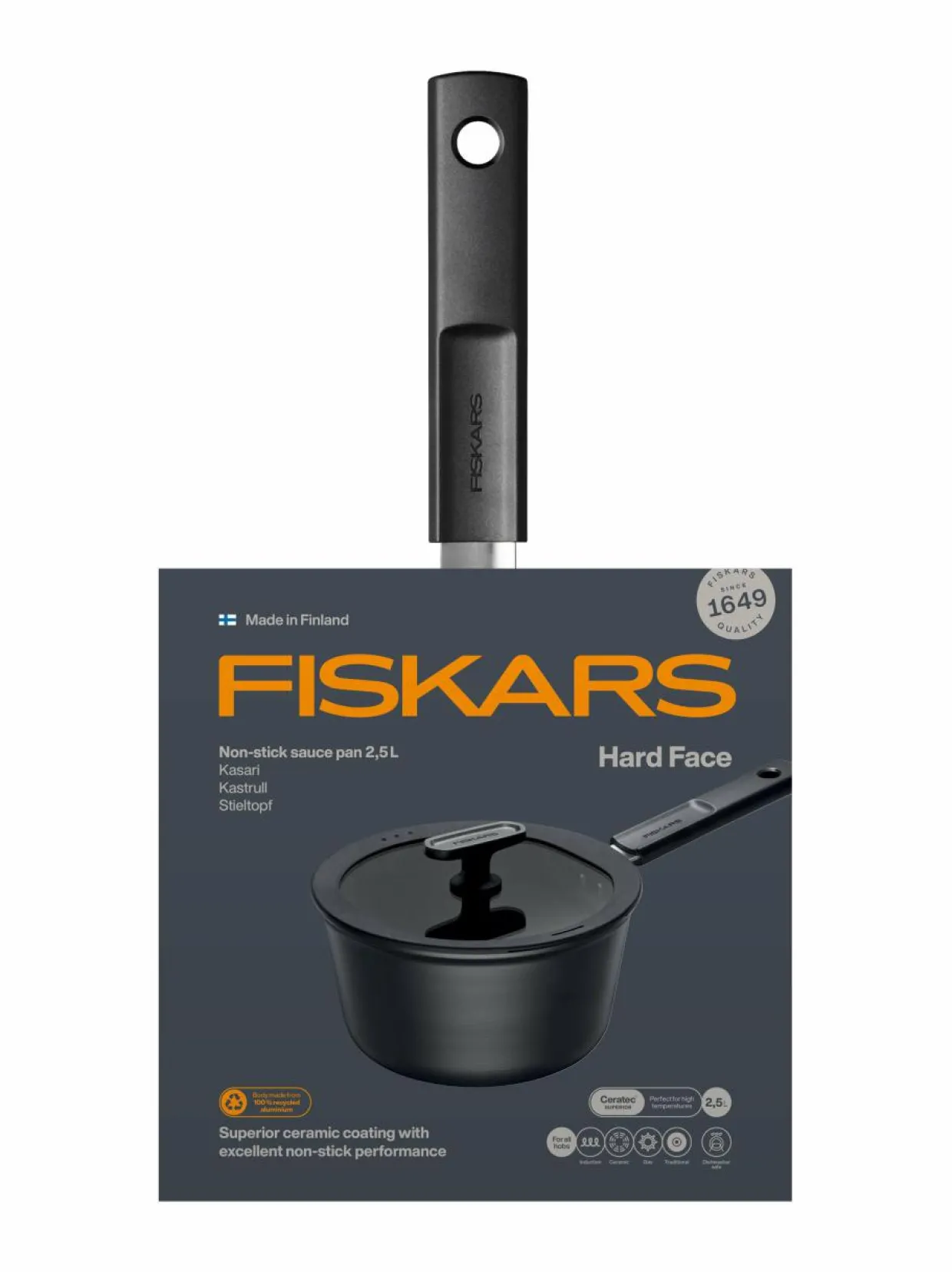 Fiskars Hard Face -sarja on suunniteltu vaativimpaankin arjen ruuanlaittoon.Tämä 2,5 litran kasari on modernin muotoilun taidonnäyte. Kasarin paksu alumiinirunko kuumenee tehokkaasti ja tasaisesti. Kasarilla valmistat maito-, kerma- ja juustopohjaiset ruoat käden käänteessä ilman ainesten tarttumista kasarin pohjaan.