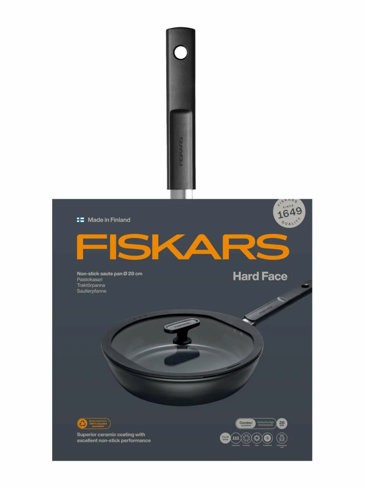 Fiskars Hard Face -sarja on suunniteltu vaativimpaankin arjen ruuanlaittoon. Tämä kannellinen pannu on modernin muotoilun taidonnäyte. Se sopii erinomaisesti kaikenlaiseen paistamiseen ja erityisesti kastikkeiden valmistukseen korkeiden reunojen ansiosta.