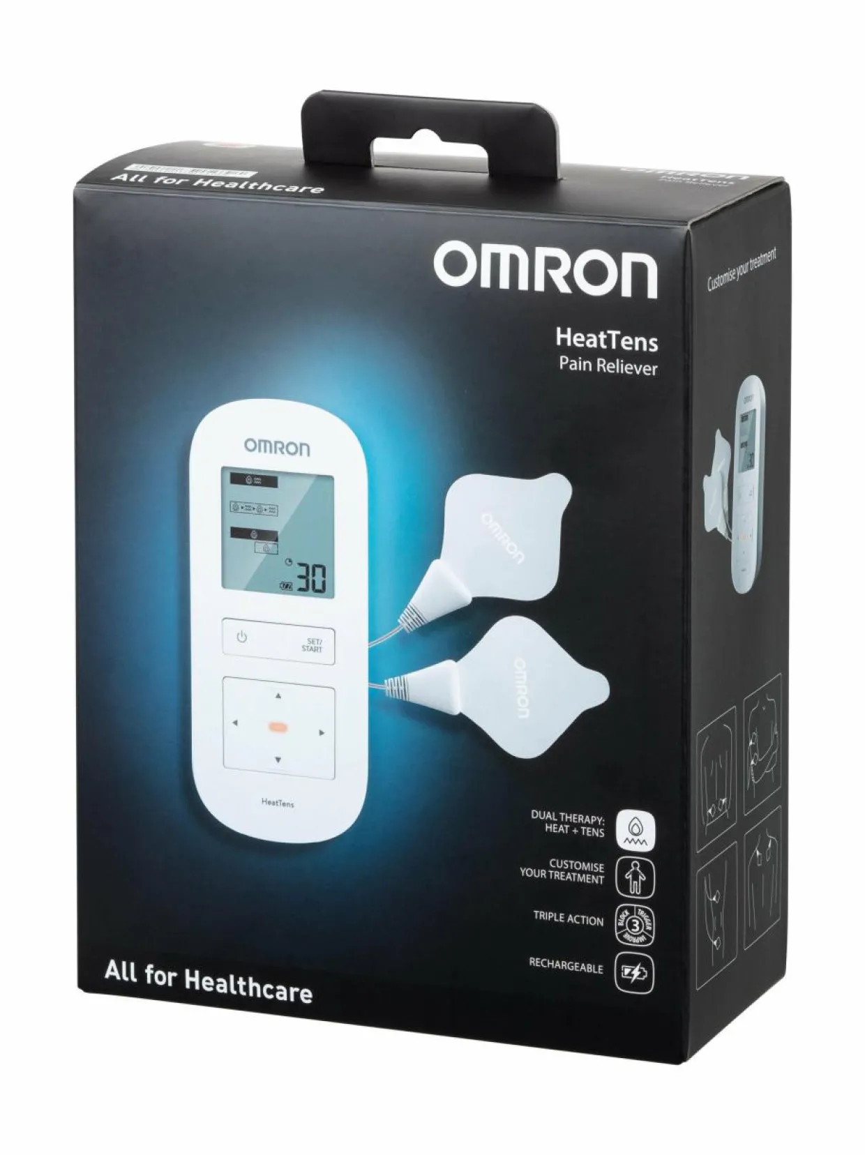 - Omron yhdistää kaksi lääkkeetöntä hoitomenetelmää: TENS-teknologian ja lämmön.